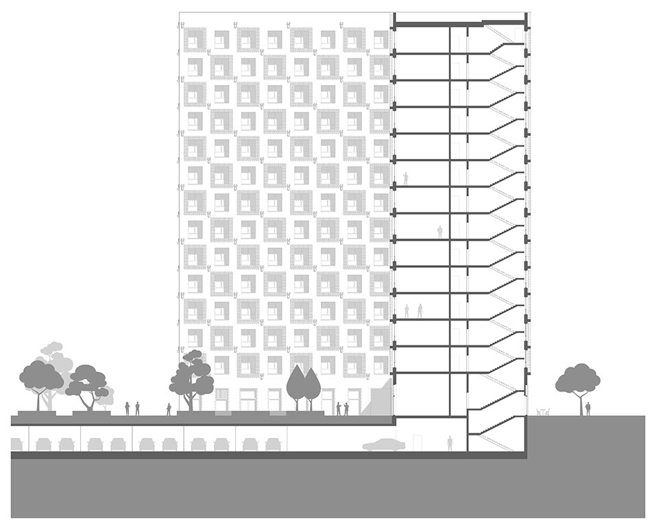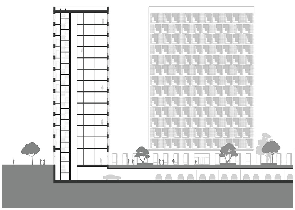 Lot 12 has an underground parking garage and a private courtyard on top. Entrances are from the ajacent streets, one entrance hall for two walk-ups. Towers are 12 floors each, built in in-situ cast concrete.