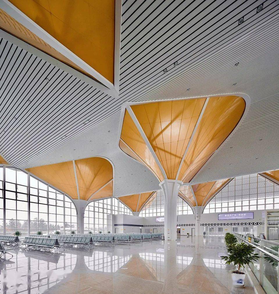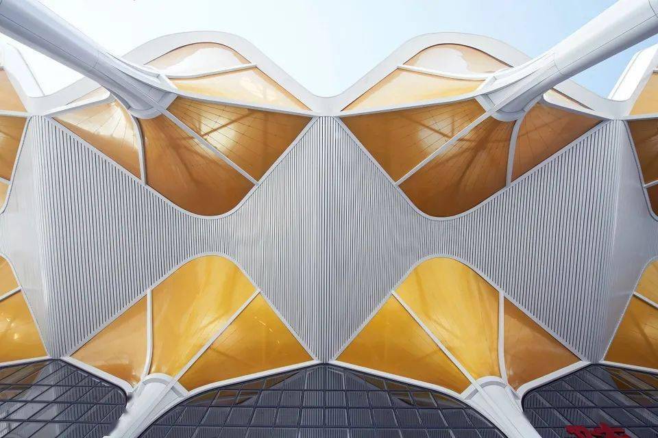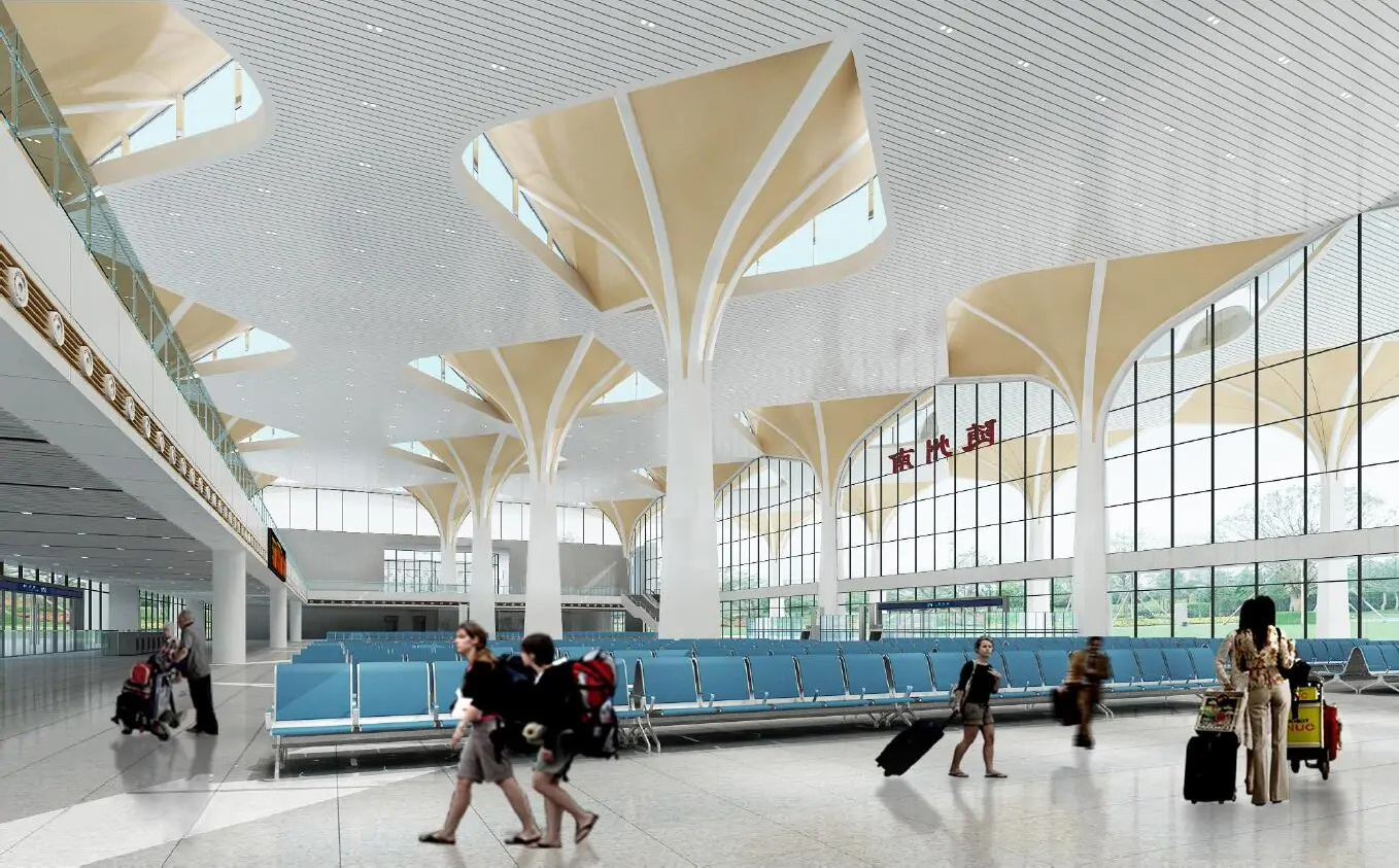 In order to abstract express the shape of Ginkgo leaves, Suizhou South Railway Station adopts "umbrella unit" as the main structure. A number of "umbrella shaped units" form a tall and straight tree structure, which is connected to form a dynamic roof. The high and low buildings are like ancient villages and trees, reflecting the beauty of the architectural structure. Considering the three basic functional elements of light transmittance, diffuse reflection and gold color, the "umbrella unit" is finally made of ETFE membrane structure.