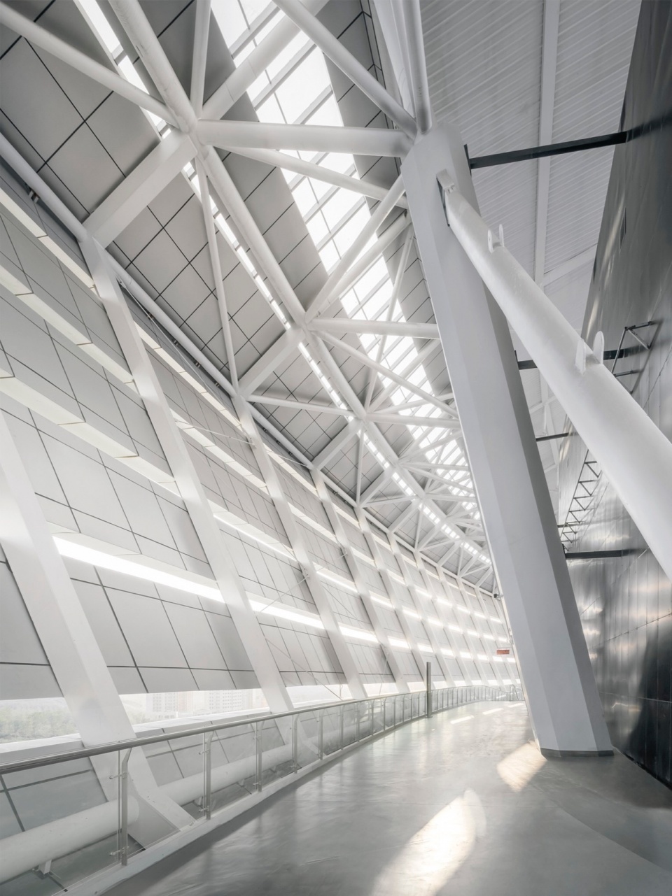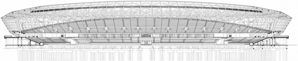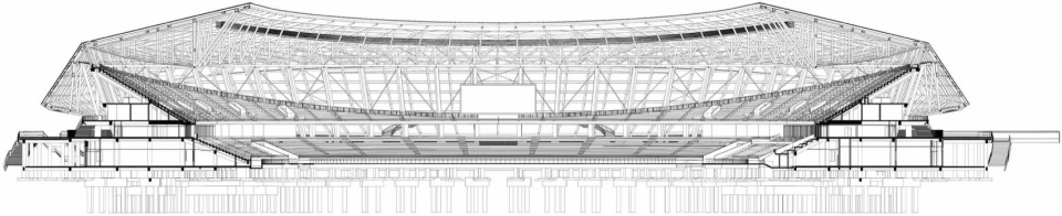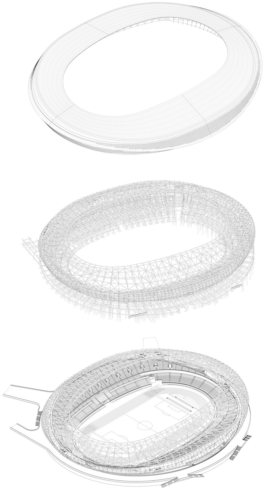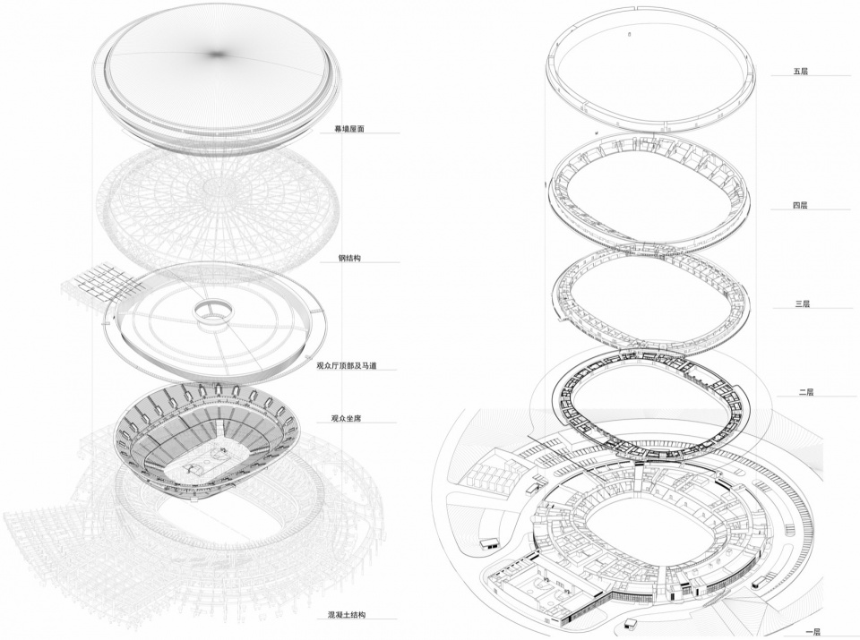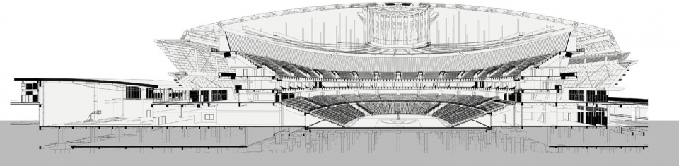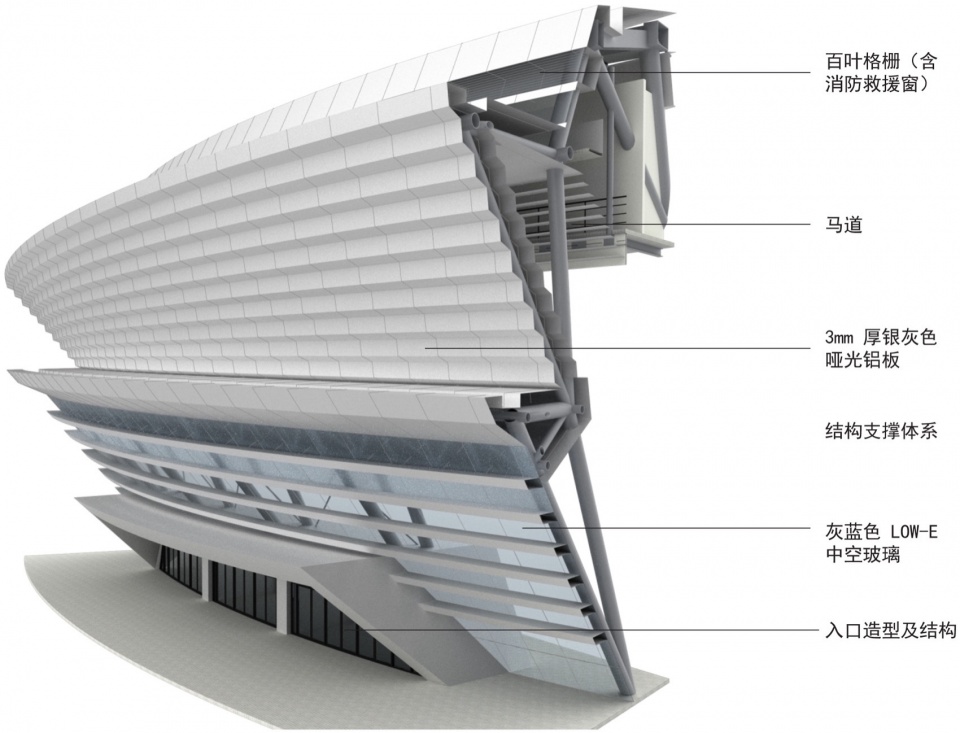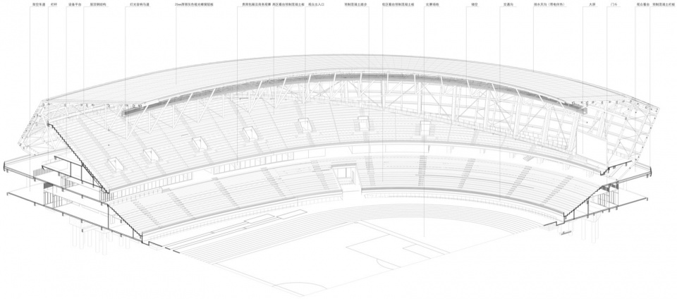 力的逻辑与建构美学,体育中心的结构体系不仅服务于功能性需求,同时构成建筑造型的核心语汇。体育馆采用轮辐式索承结构,将受力逻辑转化为视觉张力,呈现轻盈而富有动态感的空间形态;体育场罩棚则运用悬挑桁架+环向网架的复合结构体系,强调构件的韵律性排布,使结构、形式与空间相互渗透,形成刚柔并济的建筑表达。整体构造在抗风、抗震与气候适应性方面经过精细化推敲,确保建筑在极端气候条件下依然保持卓越的环境性能。
