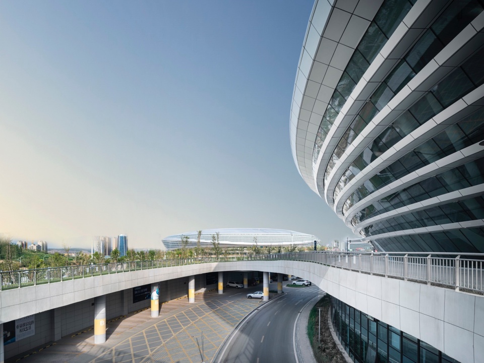 Natural Symbiosis Adapting to the Terrain. The site landscape combines the terrain generation strategy, adopting the integration mode of ecological gentle slopes and elevated platforms, blurring the boundary between buildings and nature. Through the escalators, large steps, and ramps in the commercial inner street, it is naturally connected to the external square, thus skillfully resolving the height difference in the three-dimensional space and creating a multi-dimensional walking experience. It transforms the sports building from a single functional block into a public place embedded in the urban fabric.