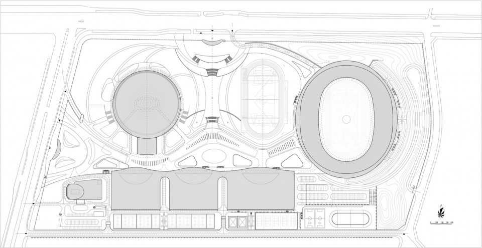 乌鲁木齐奥林匹克体育中心作为面向未来的重要体育文化场馆,集3万座体育场、1.2万座体育馆、3000座游泳馆、全民健身馆、综合田径馆、 运动员 宾馆及体育公园于一体,形成高效复合的体育建筑集群。设计通过场地适应、形态生成、结构表达与空间叙事的多重建构逻辑,回应地域文化与城市发展的双重诉求。