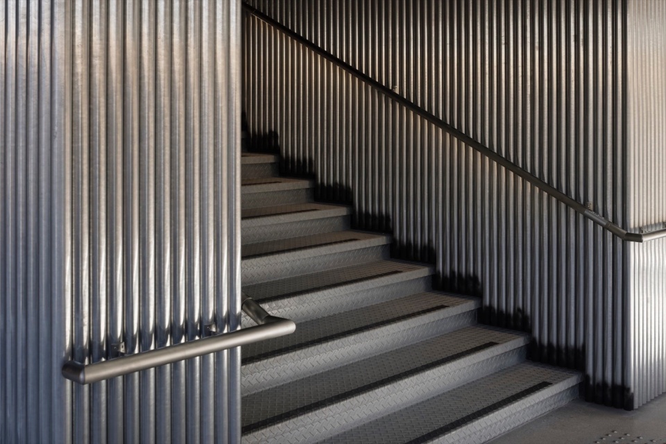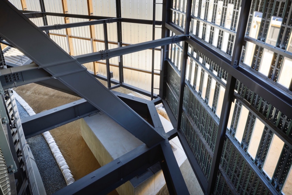 For the finishes, we explored alternative uses for temporary materials that are typically employed only during construction, reimagining them as primary finishing materials. By considering the potential for these materials to be repurposed after the Expo, we aimed to reduce both the economic and environmental impact of the pavilion. Specifically, the pavilion’s exterior is covered with an equal combination of polycarbonate panels and steel construction scaffolding. Sandbags, steel pipes (single-tube scaffolding), tread plates, lighting fixtures, fans, and other materials used in the pavilion can all be repurposed on-site. Additionally, practical materials such as blue tarps, ceiling framing materials, laminated timber, oriented strand board (OSB), and chain mesh fencing are cleverly incorporated into the finishes and interior design.