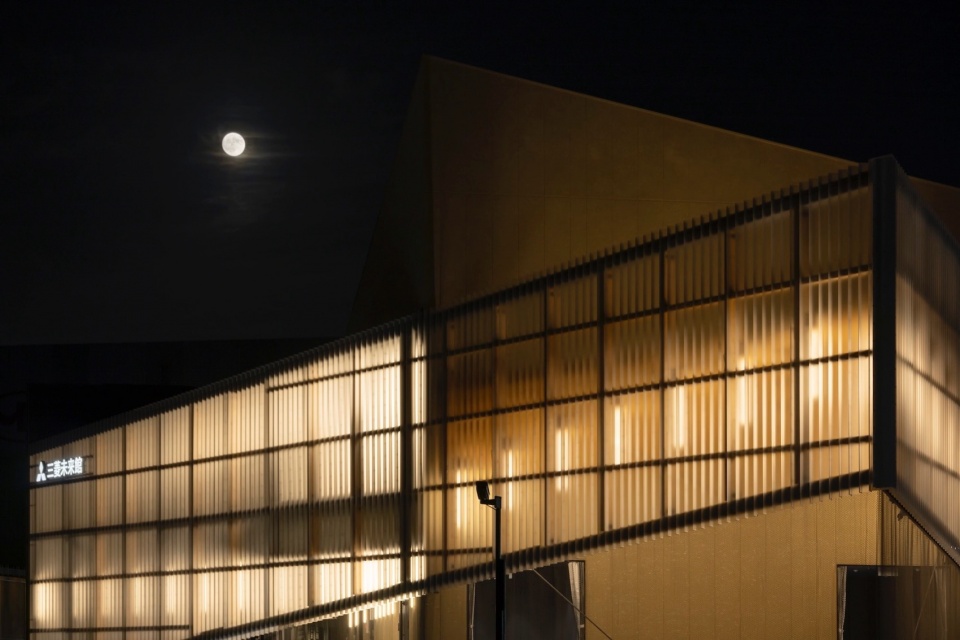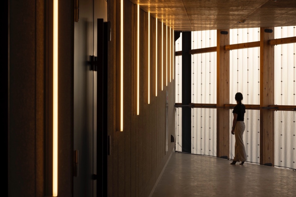 在环境调控方面,我们最大限度地减少了空调使用,大部分内部空间采用类似传统日式住宅“缘侧”(engawa)的半室外空间布局,以降低制冷需求。此外,展馆的照明设计避免了过于复杂或戏剧化的灯光效果,而是通过室内柔和光源向外渗透,形成光影渐变。这种细腻的照明方式不仅致敬了日本美学中对“幽暗”的追求,也为空间增添了层次感和丰富性。