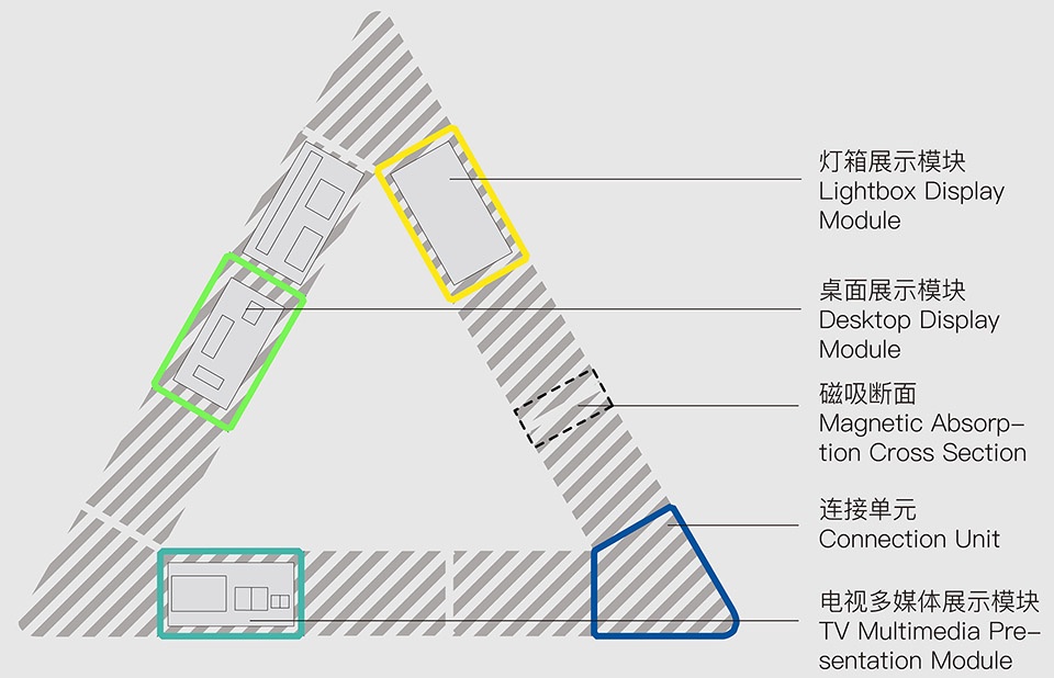 磁吸悬挂式展台系统可根据展览需求,或组合成三角展桌,或分开为展桌矩阵,也可灵活拆卸变化为开放式报告厅——满足弹性功能需求的展陈系统设计为整个空间增添了更多可能性,也满足了不同展览内容和参观流线的需求,从而优化空间使用效率。展桌所提供的辅助信息也进一步提升展览的可阅读性与观众体验,使展区的功能与视觉表现达到更高的平衡。