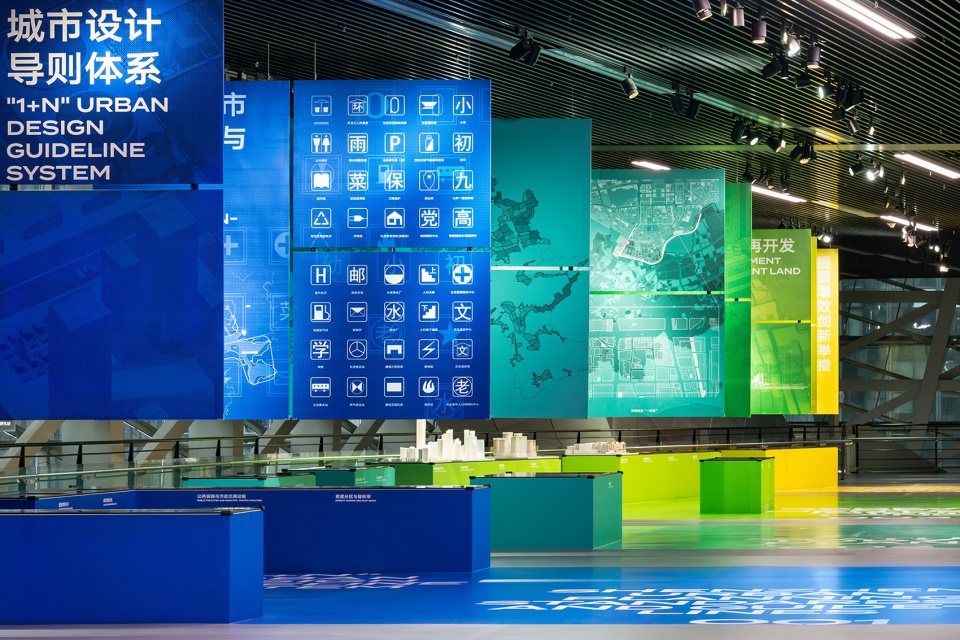 Based on the above problems, the renovation strategy revolves around spatial reconfiguration and information optimisation. Firstly, large colour block panels are introduced to strengthen the visual hierarchy through colour guidance, and the exhibition area is divided into four progressive display units to enhance the sense of spatial order and logical clarity. Secondly, the combination of hanging panels and model booths, and the use of same-coloured floor stickers to make them form an integrated display system, make full use of the high space while coordinating the models on display, enhance the coherence of the exhibition area and strengthen the overall visual tension and sense of immersion. In addition, the charts related to the statutory plans are systematically redrawn to optimise the logic of graphical expression, and the information is visualised to enhance the intuition and readability of the data, thus improving the dissemination efficiency of the exhibition content, and enabling the visitors to have a clearer understanding of the compilation system of the statutory plans of Shenzhen and the achievements of the practice.