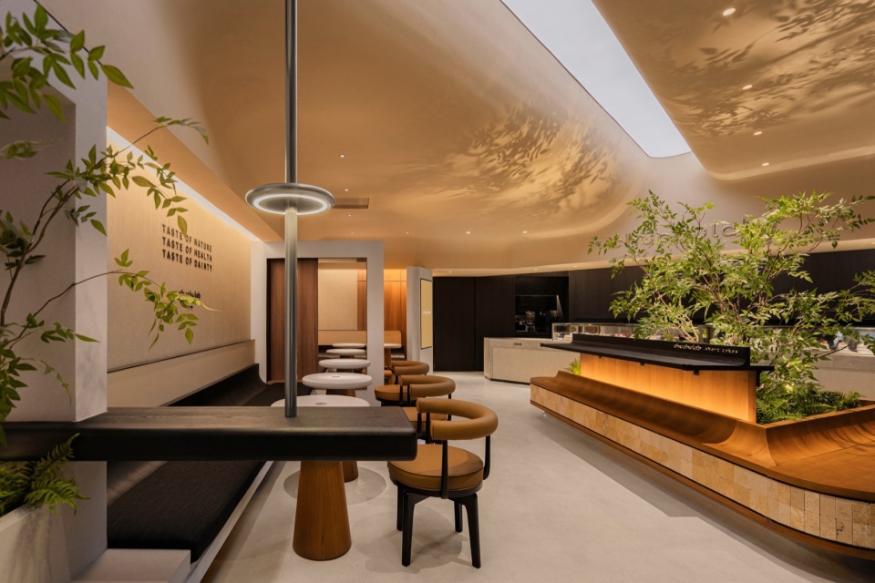 The store on the first floor is relatively isolated from natural light. In order to eliminate the sensory difference and let customers feel the warmth and naturalness of sunshine, the store adopts a lighting design that simulates natural light. The simulated light enters from the ceiling, forms a straight line, matches with the curved wall, encloses and gathers like daylight through the valley, runs through the triangular dining area in the center of the space and the greenery of it to form a central axis, connects with the cake bar, and finally extends to the wall, illuminates the logo, and attracts the attention of customers in a silent way. The lighting effect reproduces the softness and variation of natural light, and we intentionally use rational design logic to build a sense of order in the space. The soft light allows customers to enjoy afternoon tea in the store, bringing a sense of relaxation and outdoor camping experience.