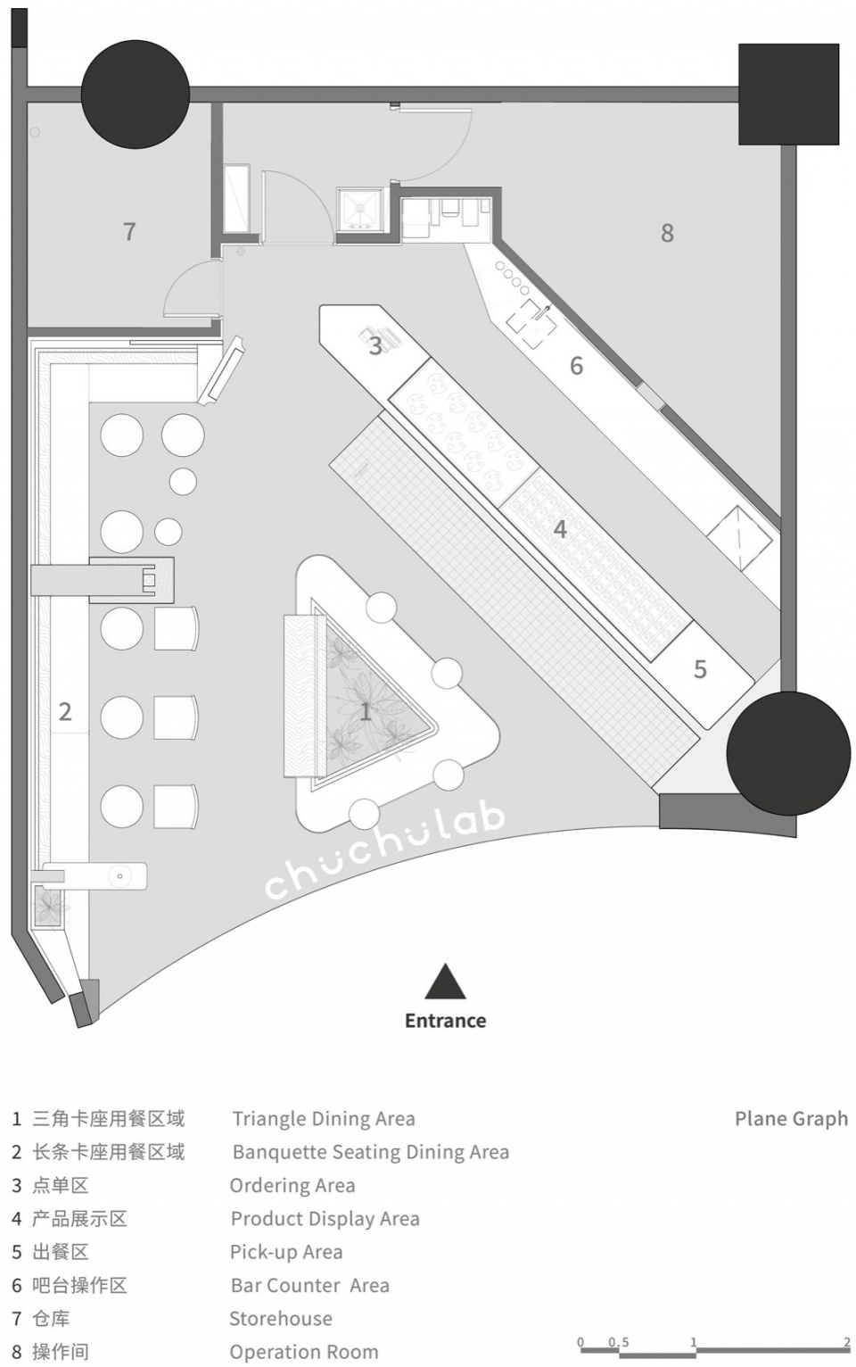 The centerpiece of the space is a triangular center island that serves as both a dining area and a focal point for visual interaction. On two sides of the triangular center island is a seated dining area and on the other side is a standing dining area. Customers can stand casually or sit comfortably, providing a variety of possibilities for people’s dining styles, as well as giving the height difference of the center island to relieve visual congestion, enhance the rhythm of the space, and make it more interesting.
