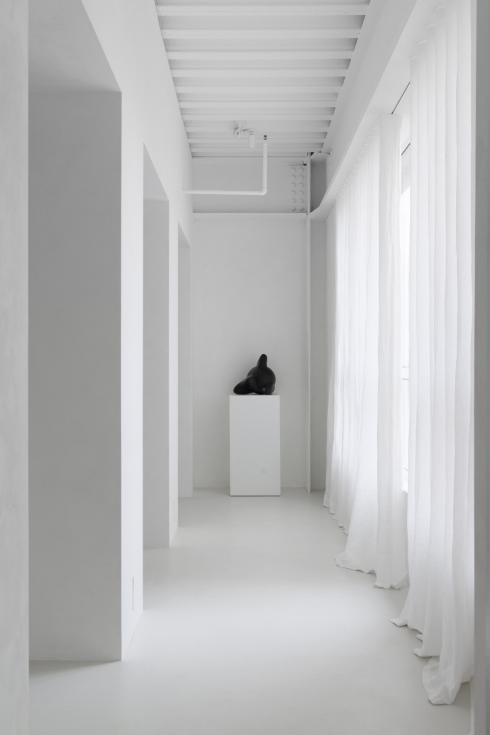 The art sculpture at the end of the corridor will be noticed outside the glass door, the grain and cracks of the natural wood forming a material contrast with the pure white micro cement. (Sculpture from the artist: Shen Mu) The fabric curtains on the whole side, translucent light and shadow, instantly make the space become light and agile. We hope that every visitor will be as happy as walking into an art museum.