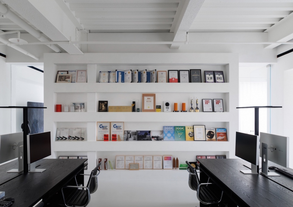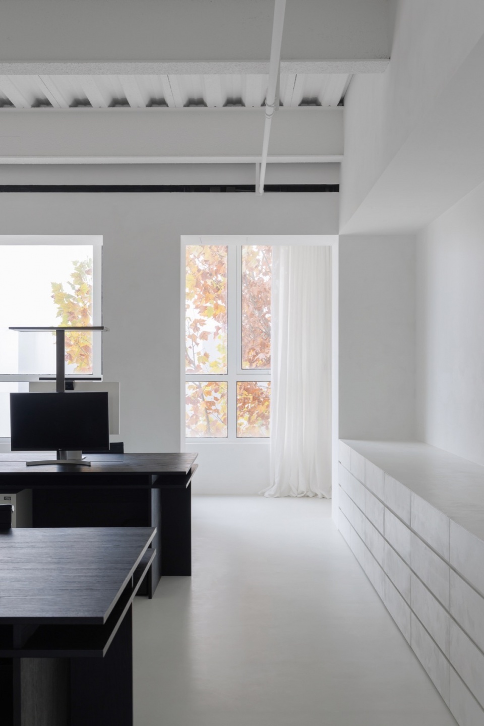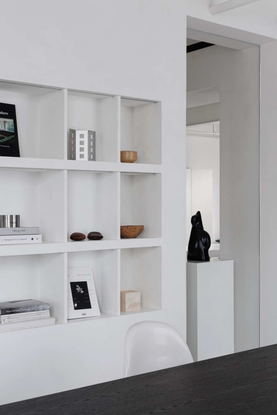 The layout of the office area is very square. It is a semi-open space with natural light coming in from three sides, which is open and transparent. The design emphasizes the strengthening of the overall axial symmetry to increase the sense of spatial order. The row of cabinets on the side is a material storage and arrangement area. The pure white micro-cement substrate can release the characteristics of each material to the maximum.