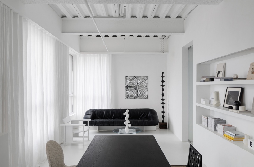 Instead of doing the traditional stereotypical office style, the conference room extends the overall minimalism and artistic tone of the studio. With the pure white space as the base and the light-permeable white curtains naturally draped, the whole space is serene and transparent, yet full of spiritual beauty.