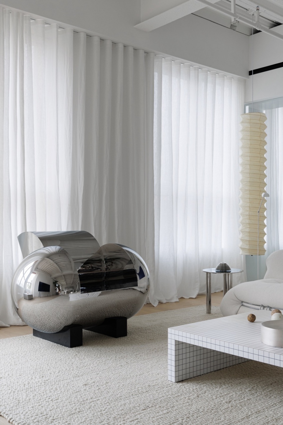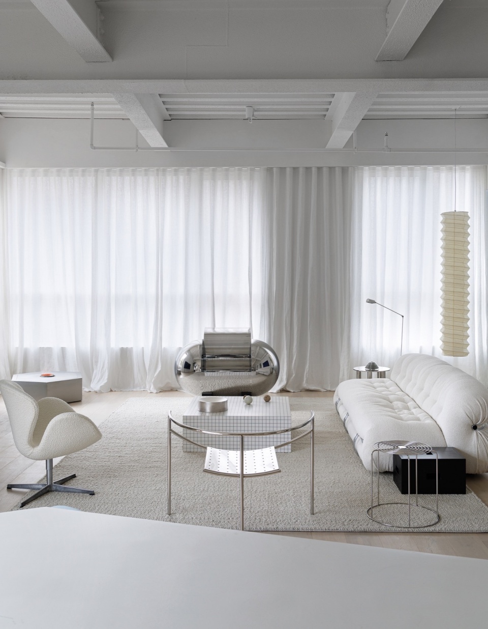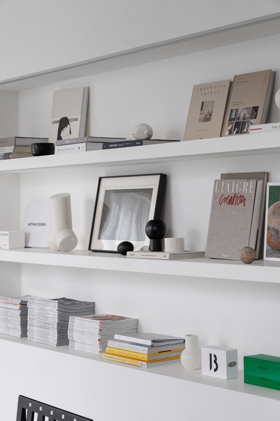 开放的空间往往对于陈列的要求更高。在这个白色的基底之上,大到家具,小到台灯、摆件,每一件物品都有自己精准的位置和存在的意义。