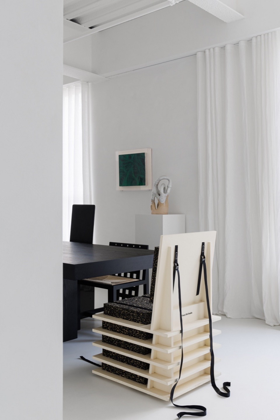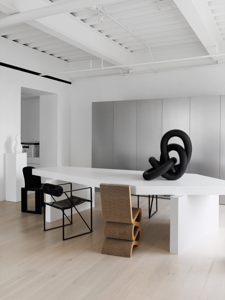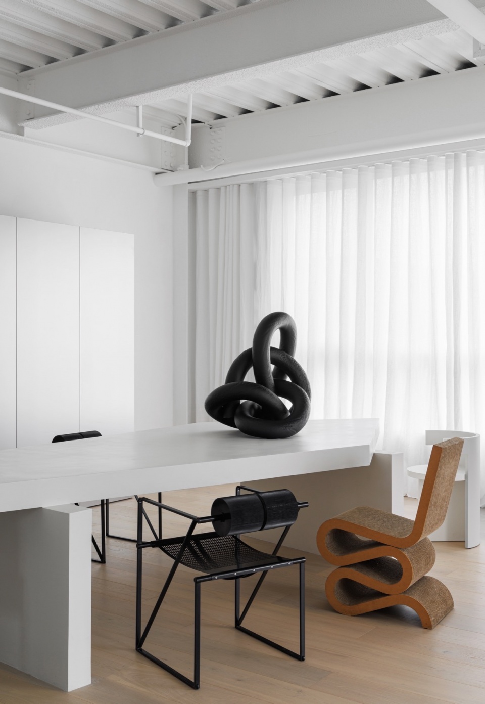 The long table is wrapped in white micro-cement, blending cleanly and purely with the underlying color of the space. It has strong lines and sharp edges, standing quietly in the space as if it were a natural artistic sculpture. The overall large metal stainless steel as a background, cold material in the light and shadow interweaving appears more exquisite, giving a sense of avant-garde pioneers and retro-future sense. The long table is surrounded by some of our collection of antique chairs, in various forms, each of which coalesces the craftsmanship and aesthetics of different eras, so that the entire space is dense with time-honored artistic flavor. (Chair 1 from the brand Alias-The Seconda second chair, designed by the Swiss architectural designer Mario Botta in 1985; Chair 2 Wiggle Side Chair is a Canadian-American architect Frank Gehry 1972 design “Easy Edges “Easy Edges” furniture series designed by Canadian-American architect Frank Gehry in 1972; Chair 3D Dialogo Chair, designed by Afra & Tobia Scarpa in the 1970s; Chair 4 designed by fashion designer Ann Demeulemeester).