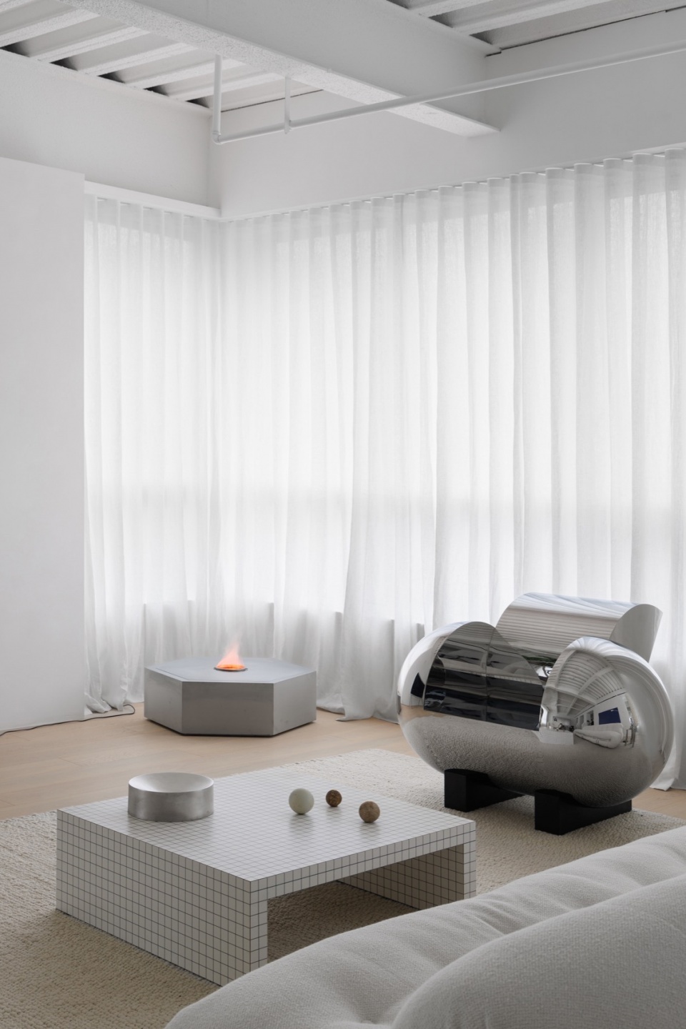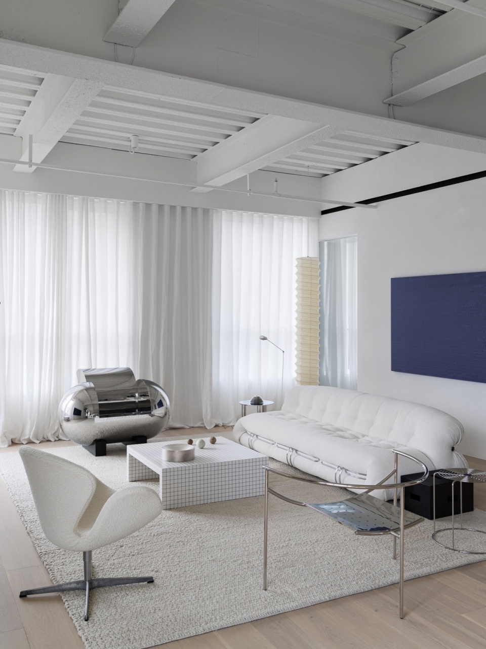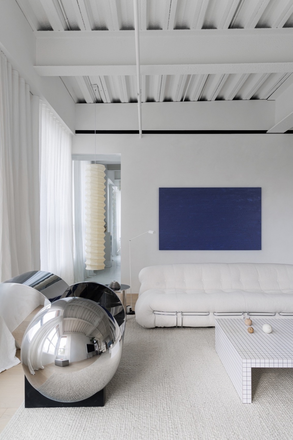 软装大多选择设计大师设计的经典家具和艺术品。每一件都是主理人亲自精选,为空间注入艺术灵魂。沙发区以白色家具为主,局部点缀蓝色,为空间带来宁静深邃的感觉。(1.沙发来自品牌Cassina-Soriana;2.茶几来自品牌ZANORTA-Quaderna)材质上主要选用了柔软的棉麻还有金属不锈钢材质,在简洁的硬装基调下,棉麻布艺让空间显得更加柔和温暖,不锈钢则带来一种年轻感和科技未来感。刚柔并济间,赋予了空间更丰富的情感表达。(壁炉来自设计师刘畅)