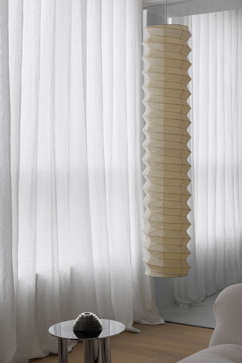 Localized integration of wooden elements, fabrics and also greenery …… Whether it is the quietness of the sunshine pouring in the daytime or the warmth under the warm light at night, it can make people feel the real warmth and comfort. (Sculpture by artist Shimu, chandelier by Isamu Noguchi Akari)