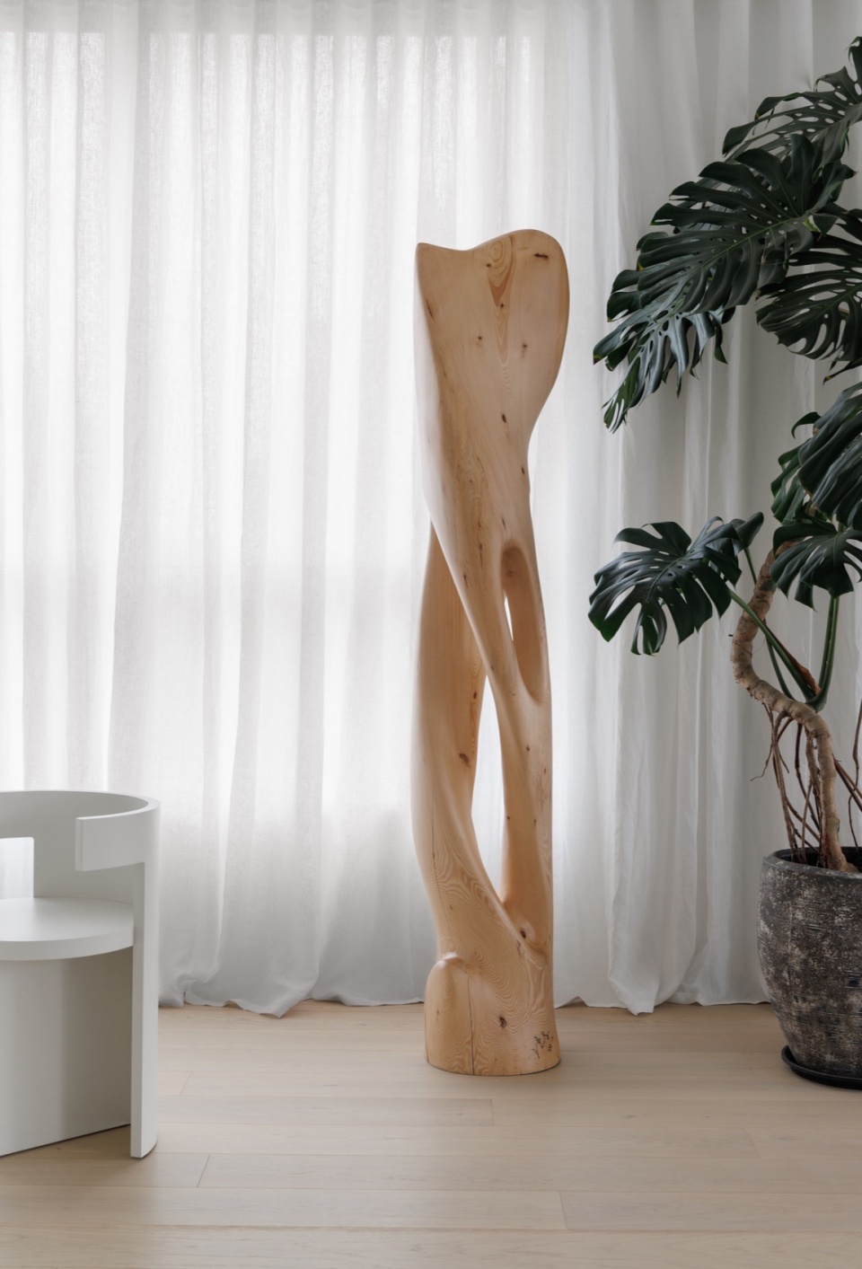 走廊尽头的艺术雕塑在玻璃门外就会被注意到,天然木材的纹路和裂痕与纯白微水泥形成材质反差。(雕塑来自艺术家:沈木)整面的布艺窗帘,透光不透影,瞬间让空间变得轻盈灵动。希望每一位来访者都像走进美术馆一样,心旷神怡。