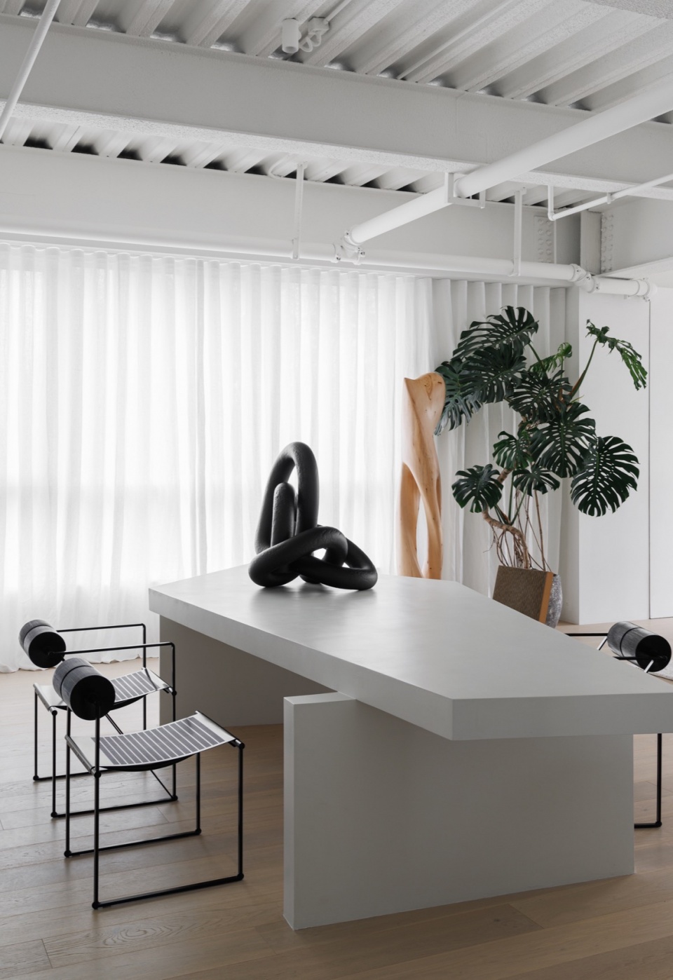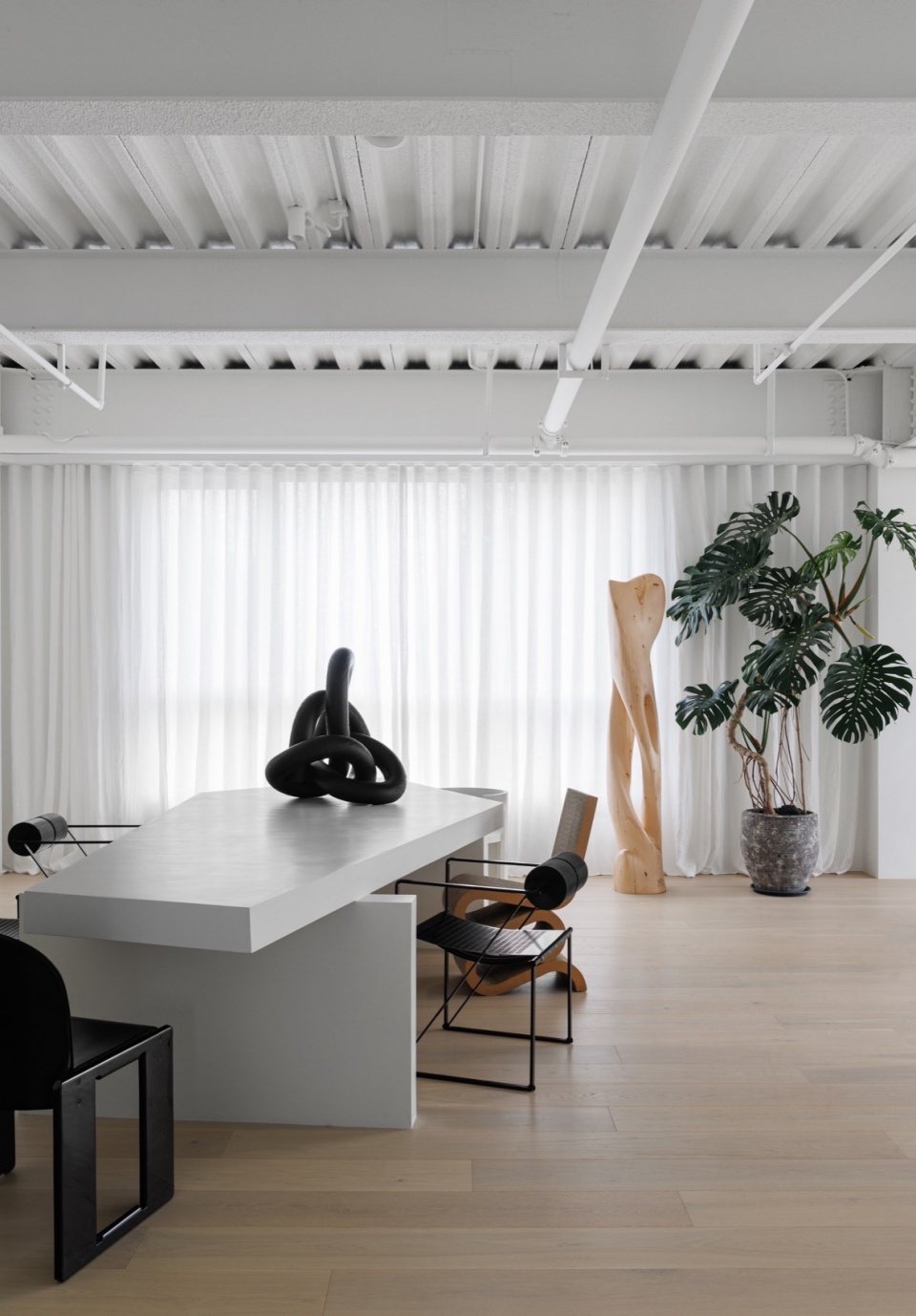 会议室没有做传统刻板的办公风格,而是延伸了工作室整体的极简主义和艺术格调。纯白空间为底,透光不透影的白色纱帘自然垂坠,整个空间宁静通透,又充满灵动美。