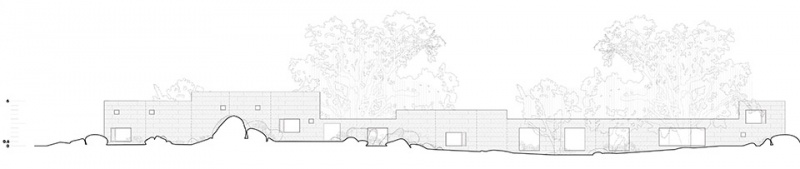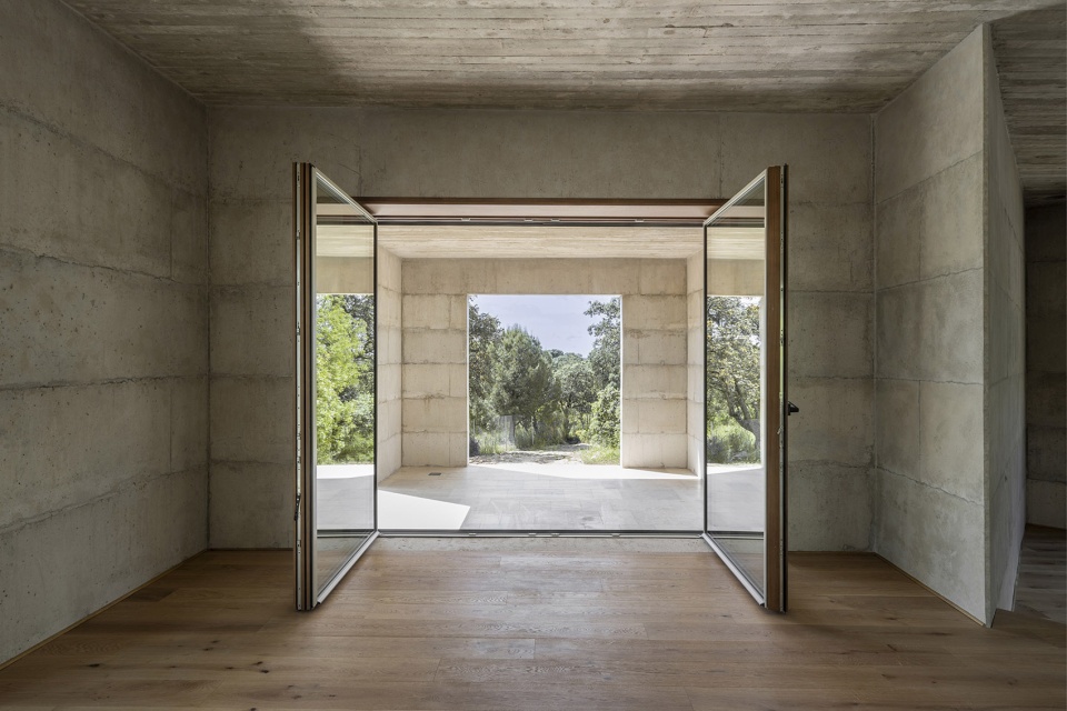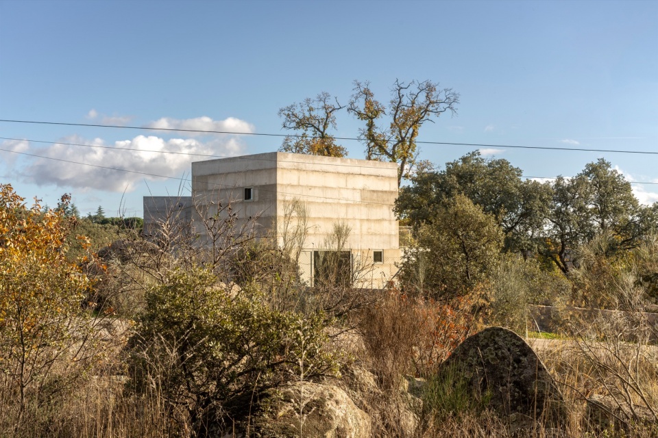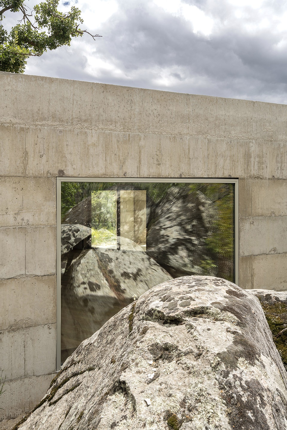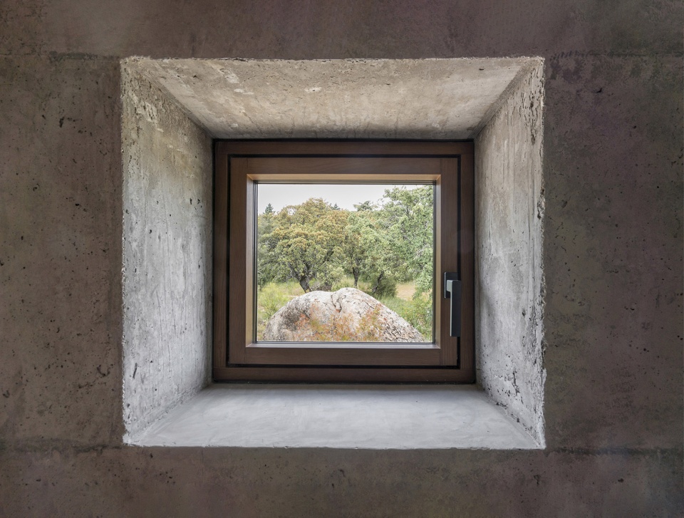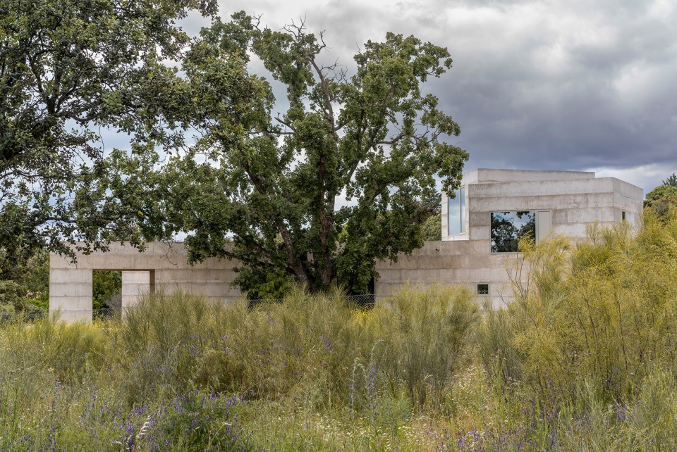 The rocky terrain on which the house stands is characterised by a gentle topography and by the imposing presence of a hundred-year-old oak tree surrounded by holm oaks and kermes oaks growing among large granite boulders. Among all these stony and vegetal elements and learning from the Ugalde house by Coderch, the house manages to find its place with an X-shaped floor plan that accommodates the programme in the rugged landscape, while framing the views of these natural features from the inside.