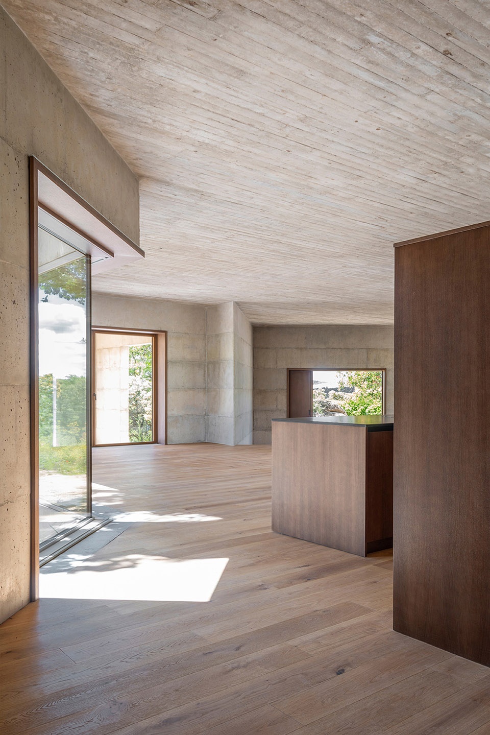 建筑完全由现场浇筑的混凝土建造,混凝土采用当地骨料,住宅的持久性和使用寿命成为对流行的“即时可视化”可持续性的一种替代方案。厚达50厘米的墙体由人工分层筑造,每层高60厘米,保温层嵌于混凝土内外叶之间,最终形成一堵内外均呈现独立砌块效果的墙体。相比于平均50年的建筑寿命,X住宅旨在世代相传,像周围的花岗岩巨石与树木一样,深深扎根于这片土地。