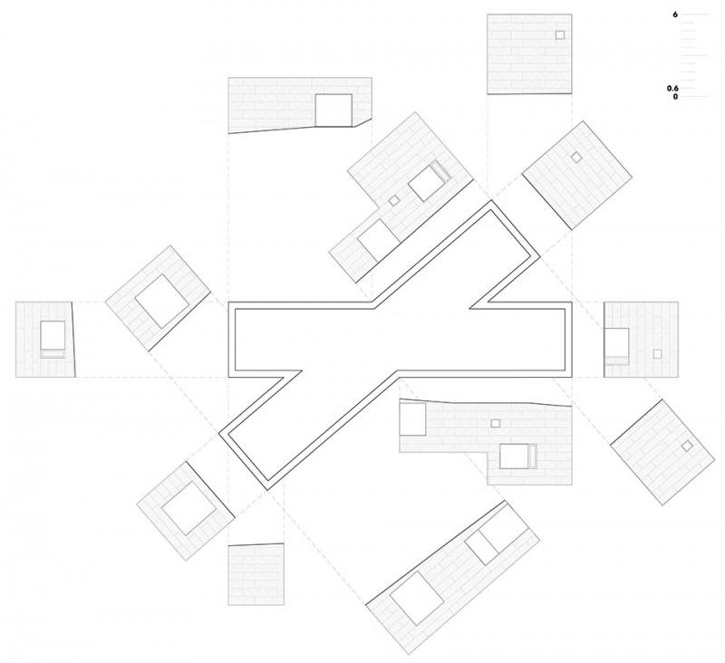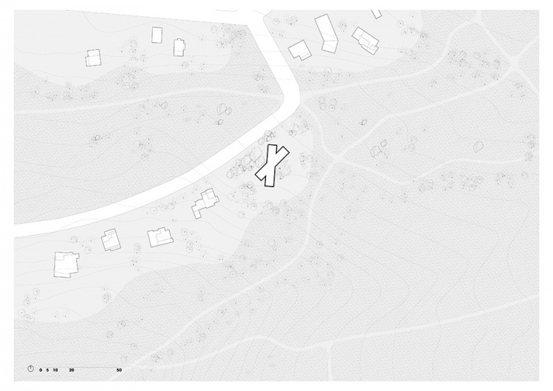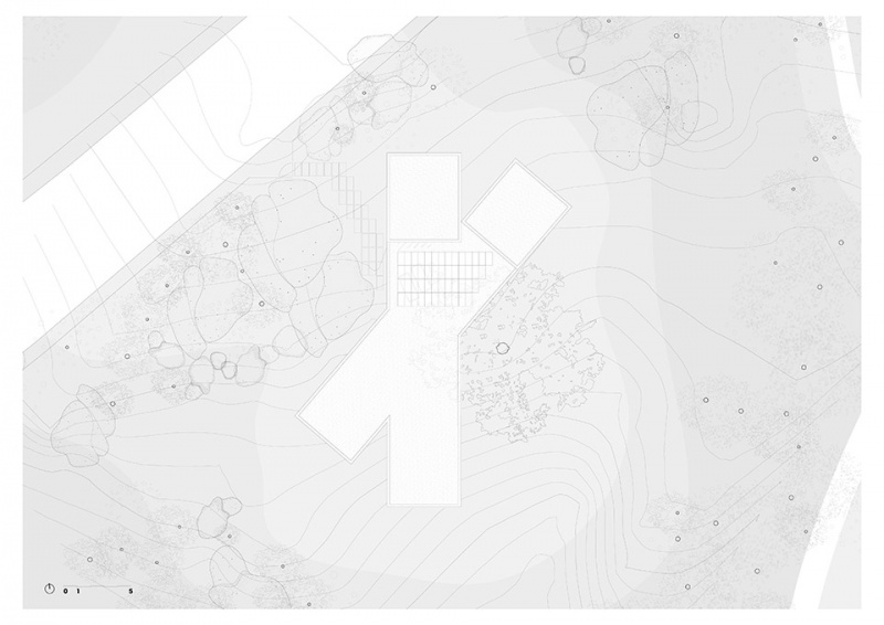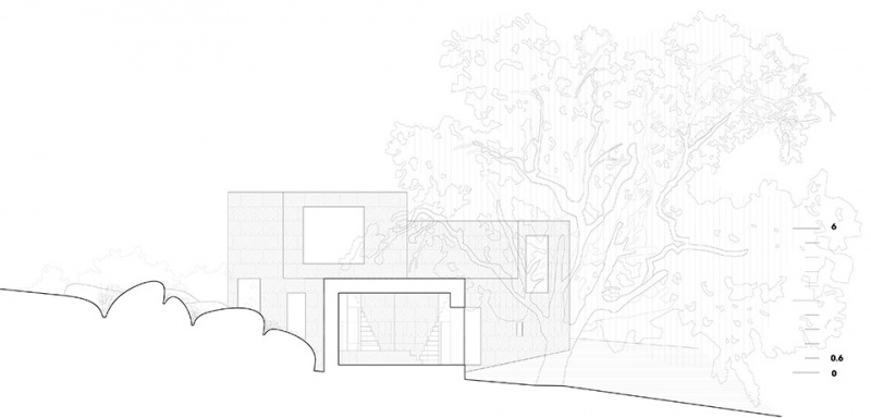 住宅所立足的岩石地形,既有起伏和缓的地貌,也有一棵百年橡树的巍然身姿,周围环绕着生长于巨大花岗岩块间的冬青橡与石栎。在这些石质与植被交错的环境中,住宅借鉴了Coderch设计的Ugalde住宅,并通过X形平面布局,在崎岖的地势中合理安置建筑功能,同时从内部框定对自然景观的视野。