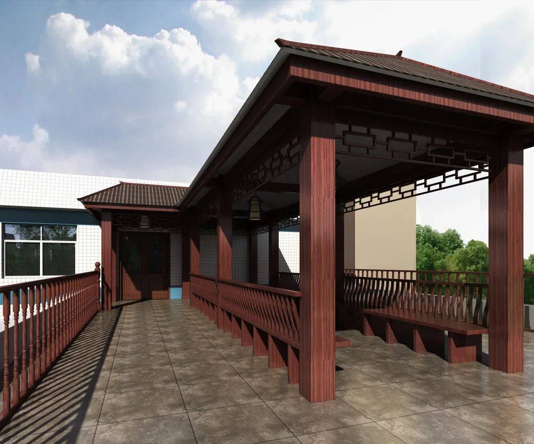 露台作为室外的休息区域,强调与室内的装饰设计做到统一。设计是将露台处设计一个中式亭廊供患者和医护人员休息,使其身心愉悦,更有益于身体健康。