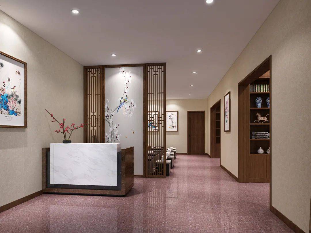 Chinese style decorative design pays attention to the sense of hierarchy of space, so the interior is divided by screens or grids. Wooden screens can be seen in both the waiting area and the physiotherapy area to partition the space, which not only plays a decorative role, but also separates the space area, reflecting the sense of spatial hierarchy.