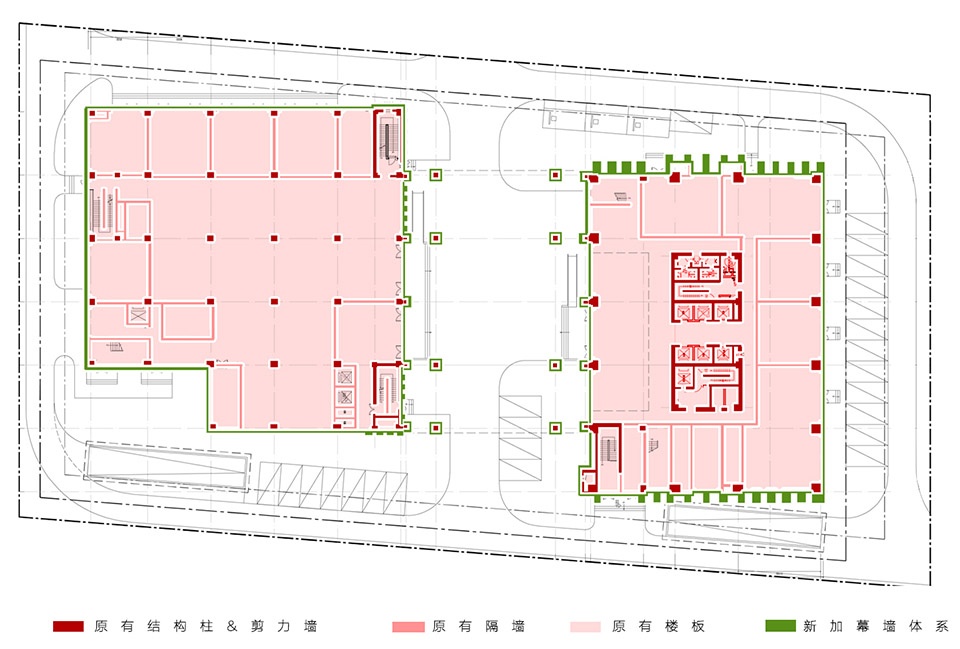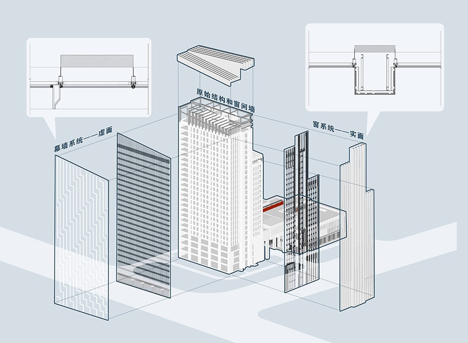▼建筑主体不改变原有结构,通过外包表皮来实现建筑立面的更新与建筑形象的提升,