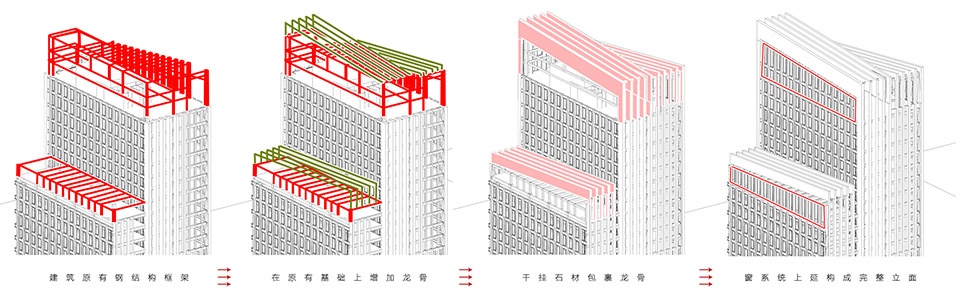 ▼建筑顶部处理手法,原有结构-增设龙骨-干挂石材-幕墙延续,