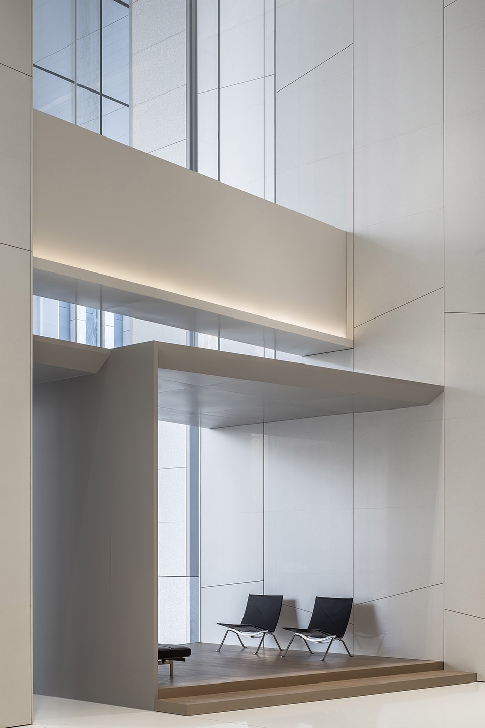 临次干道的界面采用玻璃幕墙体系,在装饰扣板上采用L形状组合由低到高,形成一种高度上渐变关系,类似流水,于动态变化中抽象出山石嵯峨,形成一种不失玩味细节的大虚化界面,其与沿主干道的界面形成一种灵与实的对比。正是这种对比的戏剧性和其形象对地域的暗喻,重新界定了这个街角的物质膜界面。