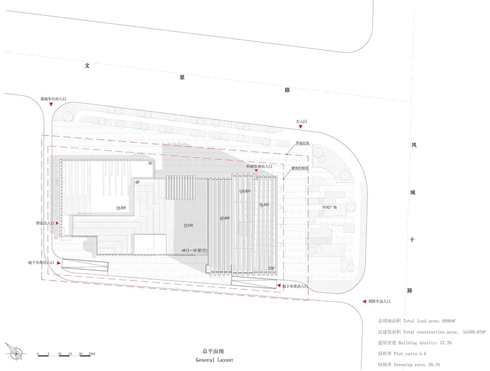 The original site features a clear entrance on Fengcheng 10th Road, while the other sides are primarily delineated by a rigid enclosure. During the transformation process, the two main urban areas in the southeast were selectively opened, and the east was designated as the Wenjing Road urban arterial road interface. In conjunction with the three-story overhead building space of the original podium, a city living room with an appealing scale was created, and the municipal administration was convinced to remove the original substation in the East. The originally closed municipal greenbelt was also adjusted and opened at the East Interface. Simultaneously, a pedestrian walk-in square was established at the intersection of Wenjing Road and Fengcheng 10th Road, redefining the character of the originally closed block on the corner.