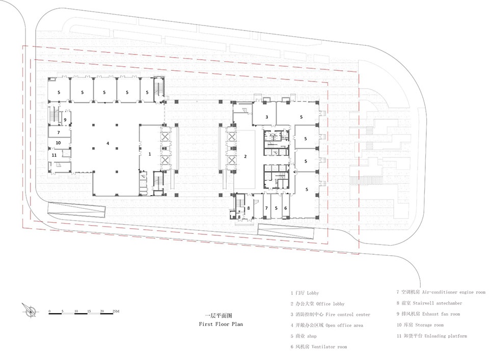 首先对原来功能为实验室和会议的裙房化整为零,把实验室功能重新置换,分为景深和面宽比例为3:1的零售商业,并引入目的型消费旗舰店如主题餐饮和社区服务银行,并强化裙房屋面的公共价值,裙房顶层结合屋顶平台引入办公自用咖啡和轻餐业态以引导交流发生。塔楼功能定义为文创类办公租赁,另外也引入WeWork、西北总部和普汇中金自用总部办公进驻。