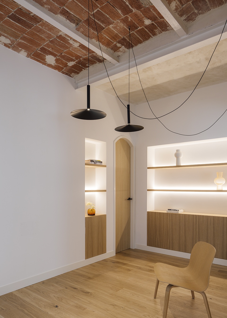 Materially, the project expresses by itself; the original brick is accompanied by oak wood in floors, furniture and carpentry, and white paint as a general background for every room.