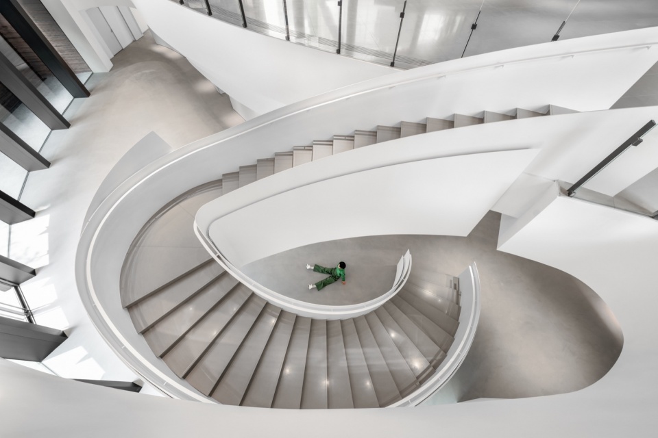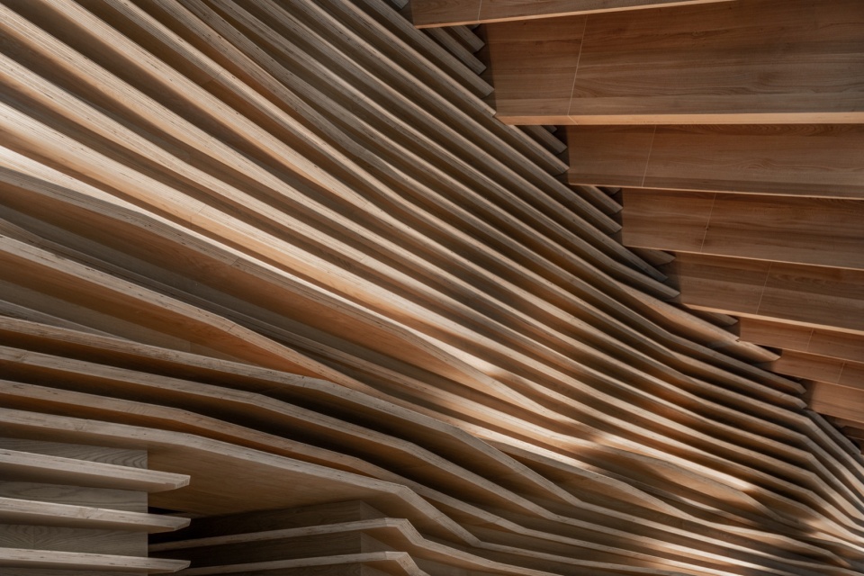 地下展览空间通过百叶天花、褶皱墙面及螺旋楼梯,与地面相连,营造出光影交错的洞穴式空间。不同于传统的白盒子展览空间,项目试图在城市之中融入自然,让人们在景观与体验的层面感受建筑与环境的共生。