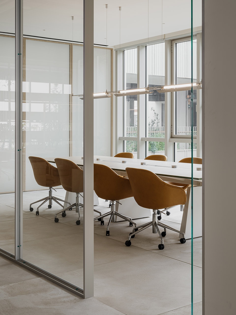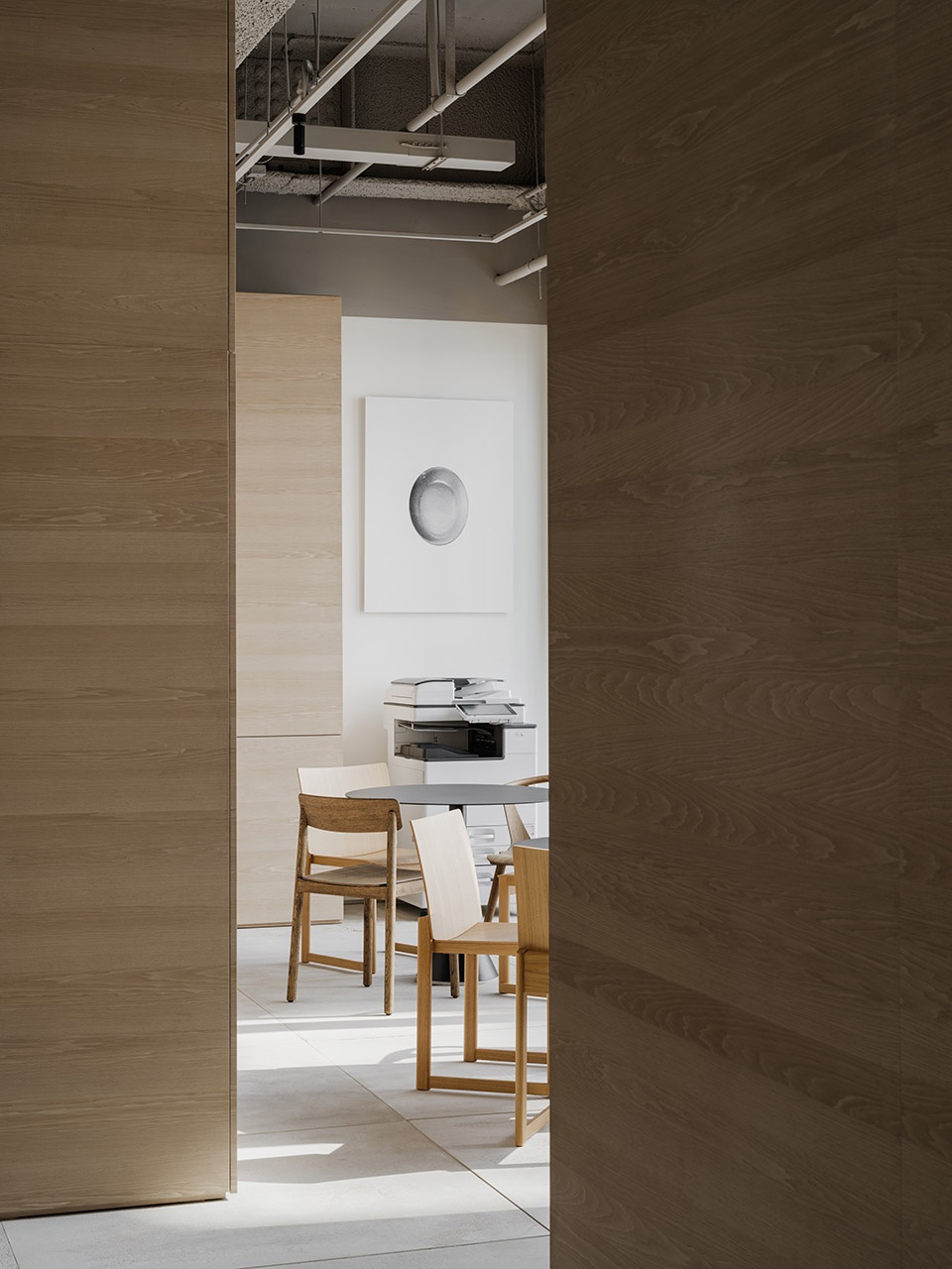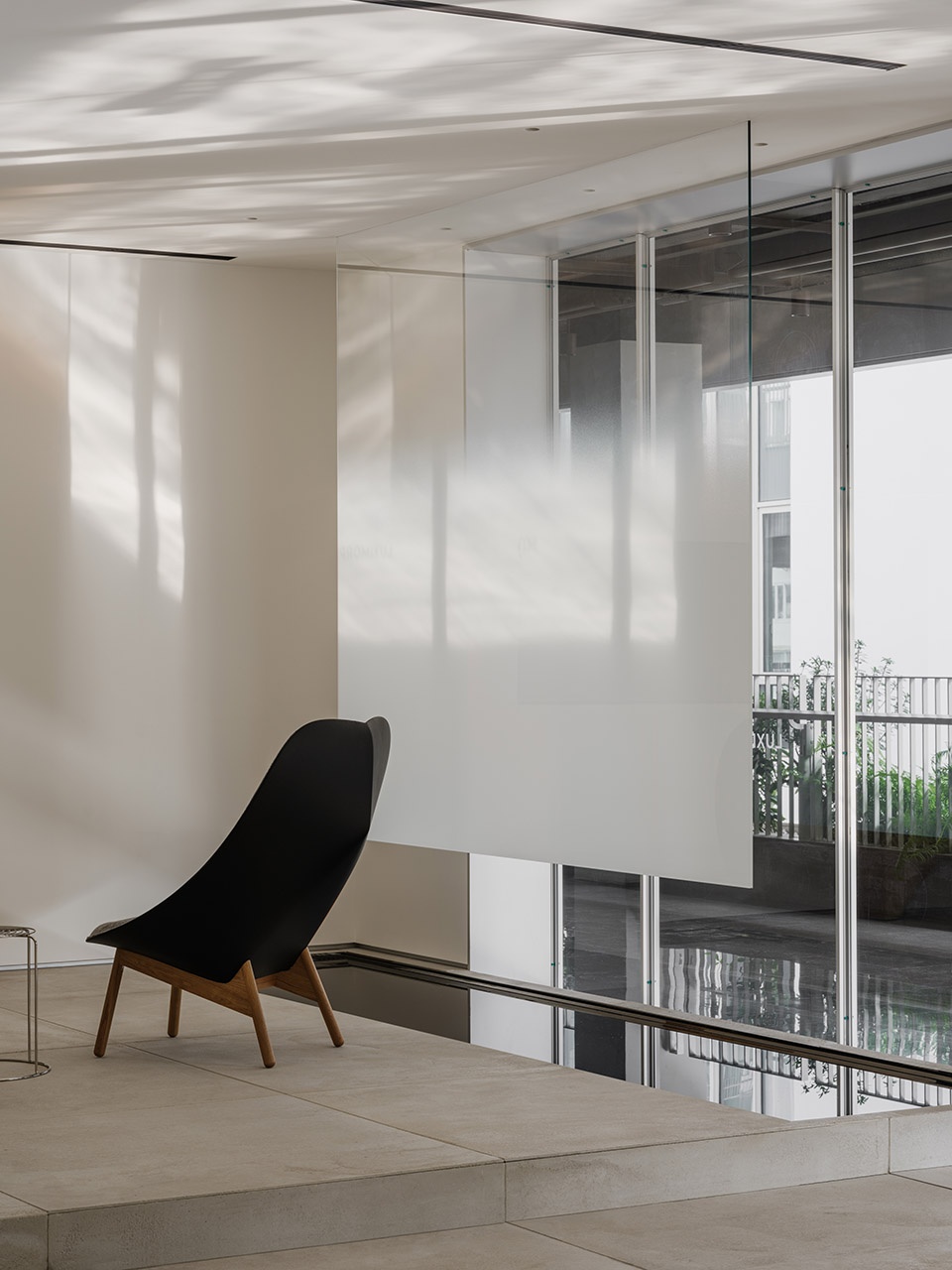 The dynamic communal space serves as a reception and exhibition, as moving inward, the decoration and colour scheme soften, aligning with the refined atmosphere of a gallery. The left-blank wall and corridors of the atrium brought an artistic stillness, offering a quiet pause that tempers external distractions. Behind this transition with curtains drawn back, reveals a secluded and comfortable meeting room.