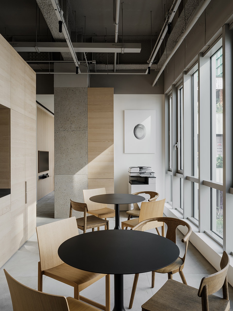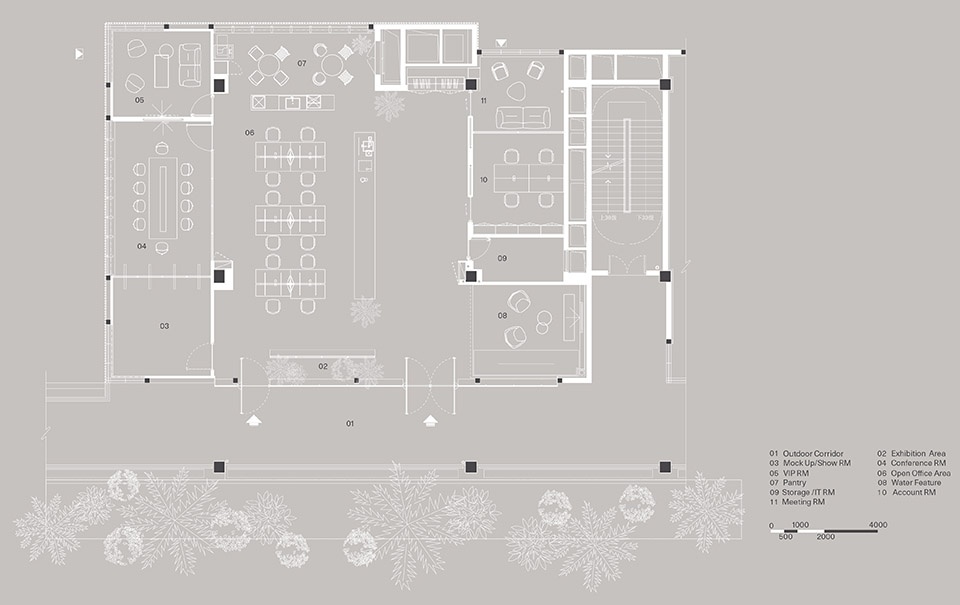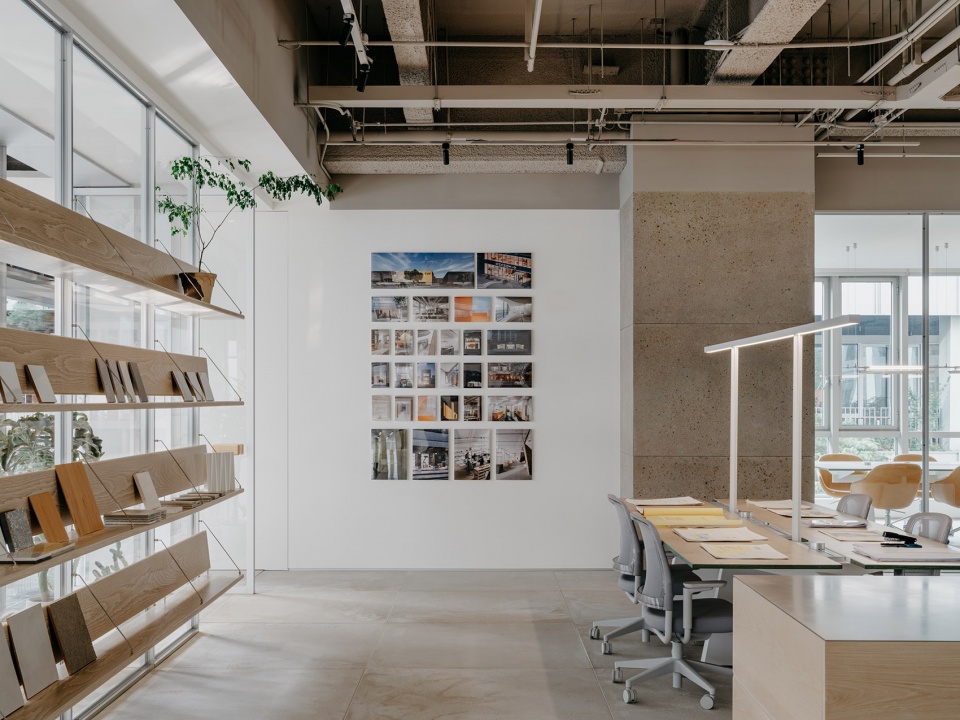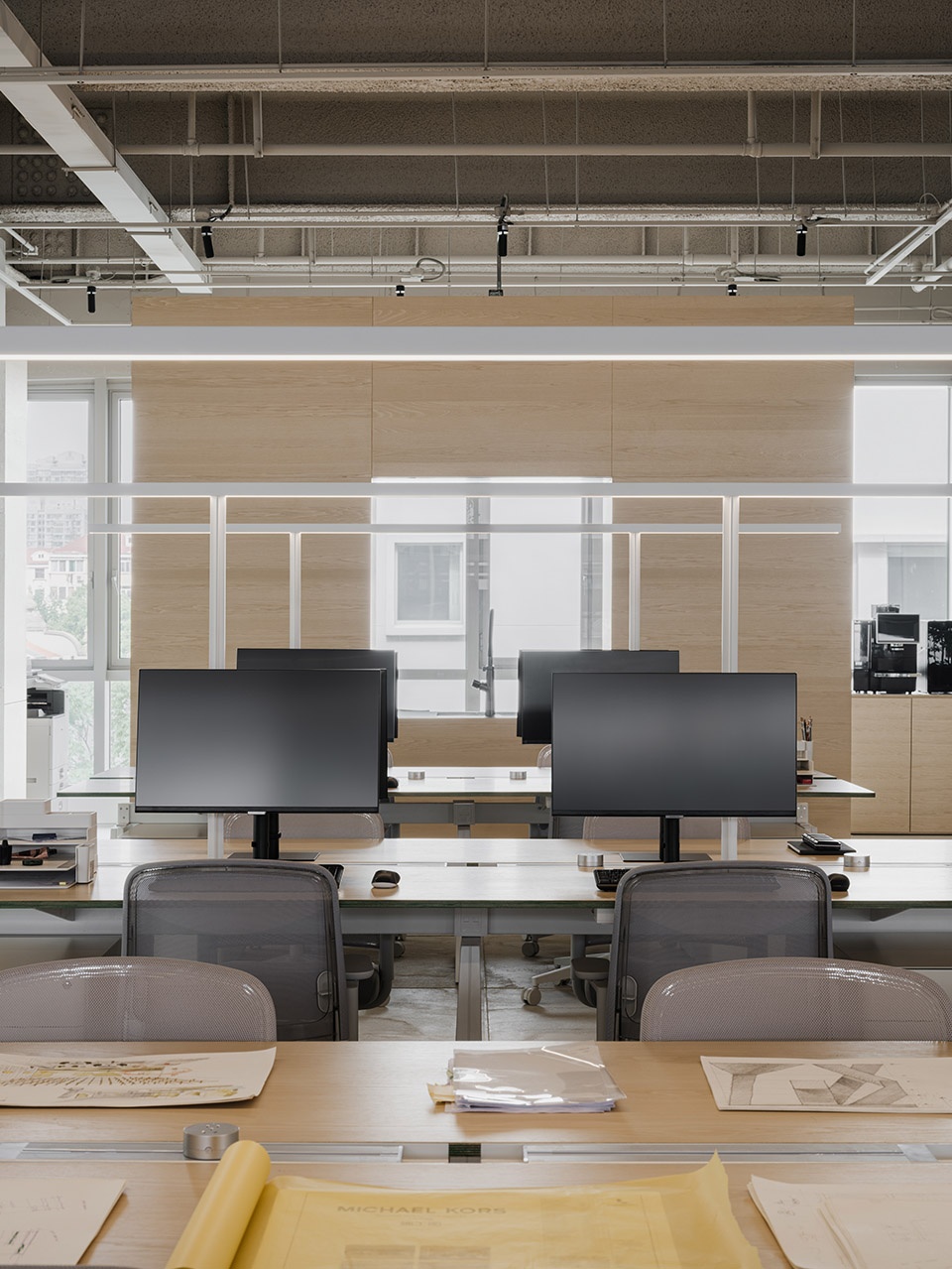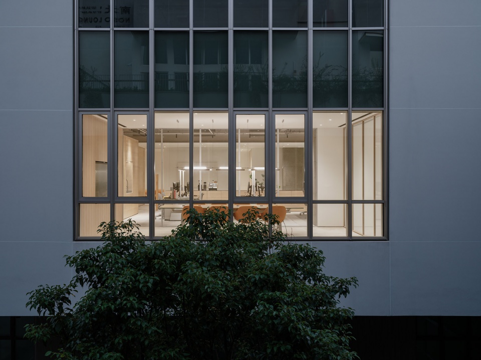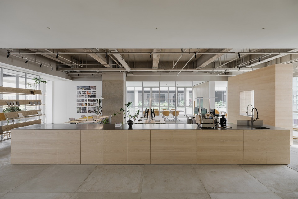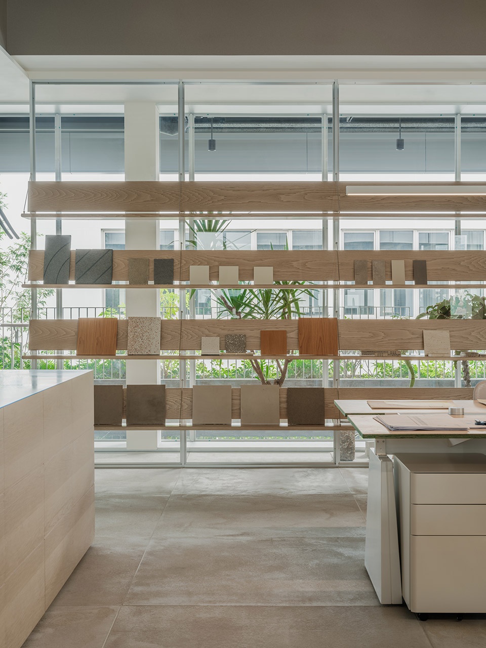 The office is located on the south-facing second floor of the Columbia Circle Phase 2, featuring a row of full-height windows, which allows abundant natural light to flood the space and extends the greenery from the community’s corridor into the space. At the entrance, a set of material display walls sections the space, while defines a mini garden window, serving as a screen of the office area.