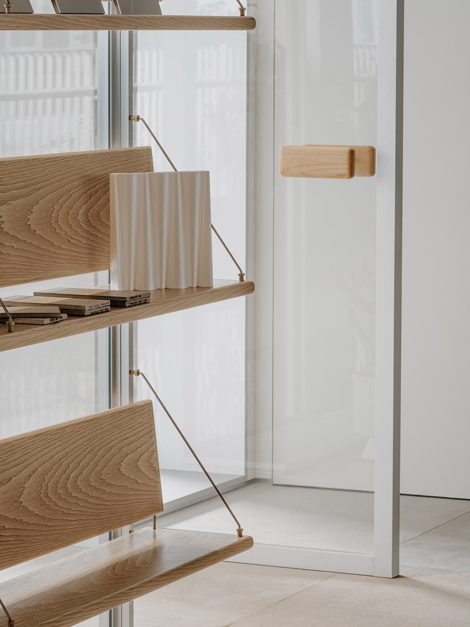 The static workspace features Say’s custom-designed long tables with no partitions between workstations to foster a more flexible and collaborative environment. The water bar counter incorporates a cut-out section, framing the view of the cedars and ferns, with lights filter through the glass that radiate the space with warmth. The left area is functioned as a meeting room. Sliding open the inner partition, the showroom can be used as sample storage, enabling hands-on interaction.