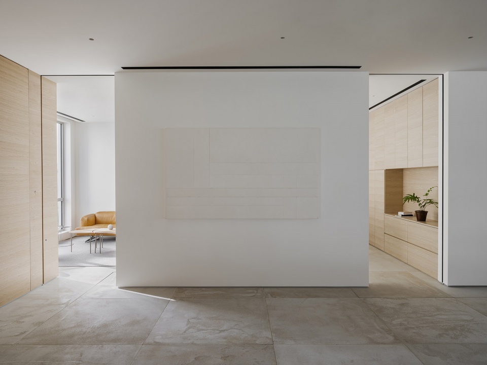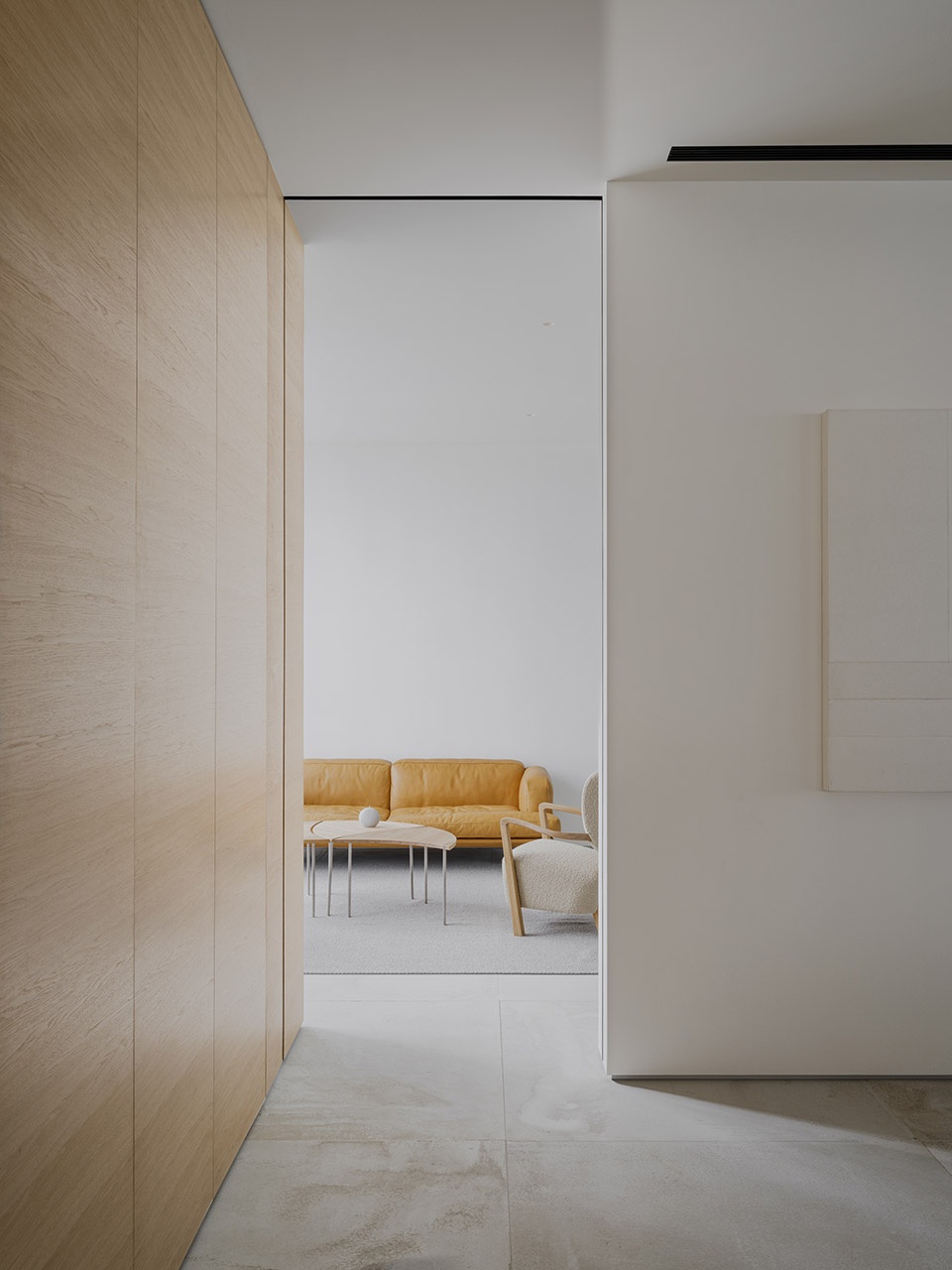 动态的公共区域承载会客与展陈两个功能,逐渐向内,装饰与色彩趋于平和,贴合展厅的设计氛围。中庭留白的墙面与过道,带来艺术性的沉默与停顿,将嘈杂与纷扰削减,短暂的缓冲过后,拉开门帘,是隐秘而舒适的会客室。