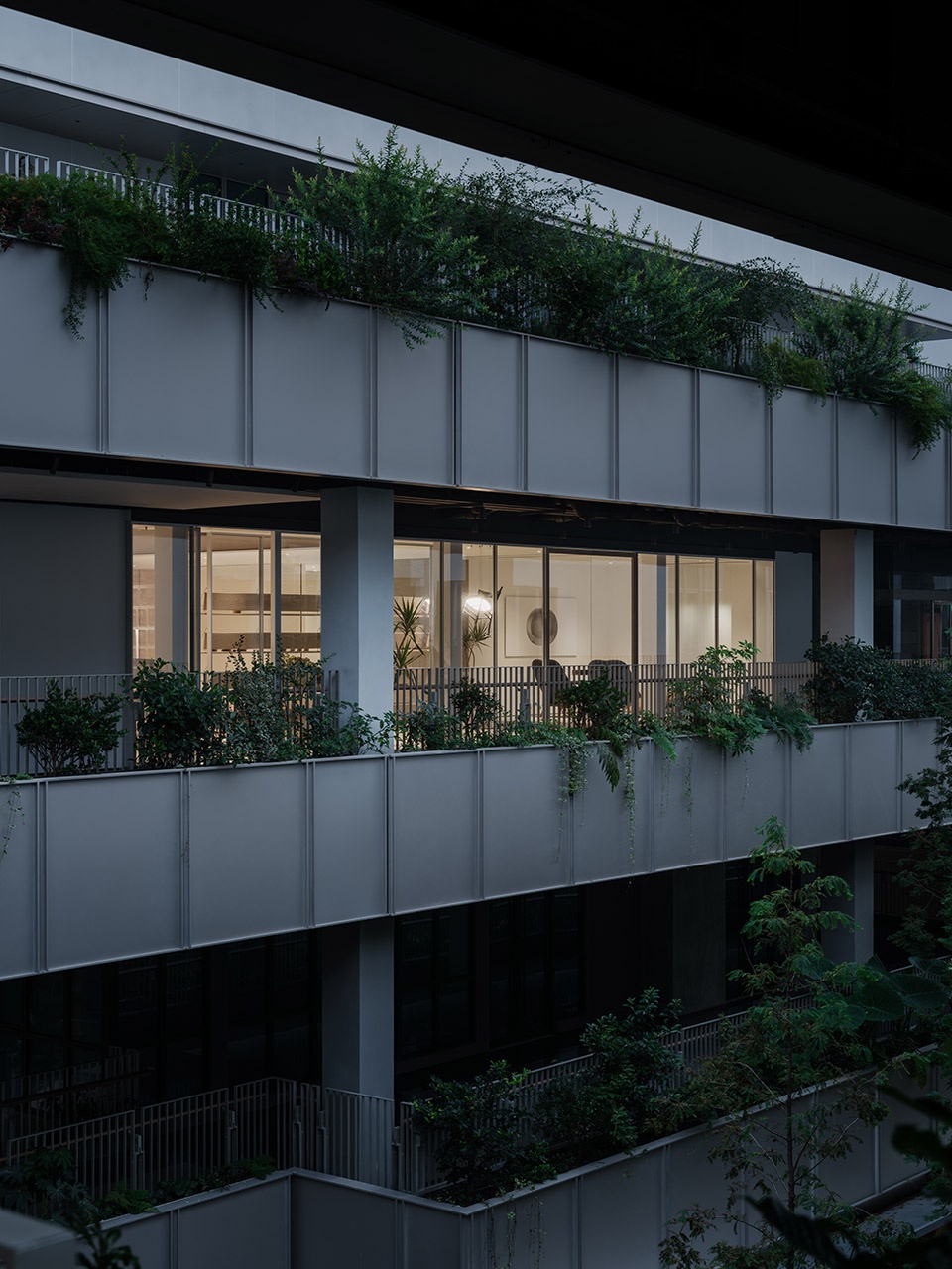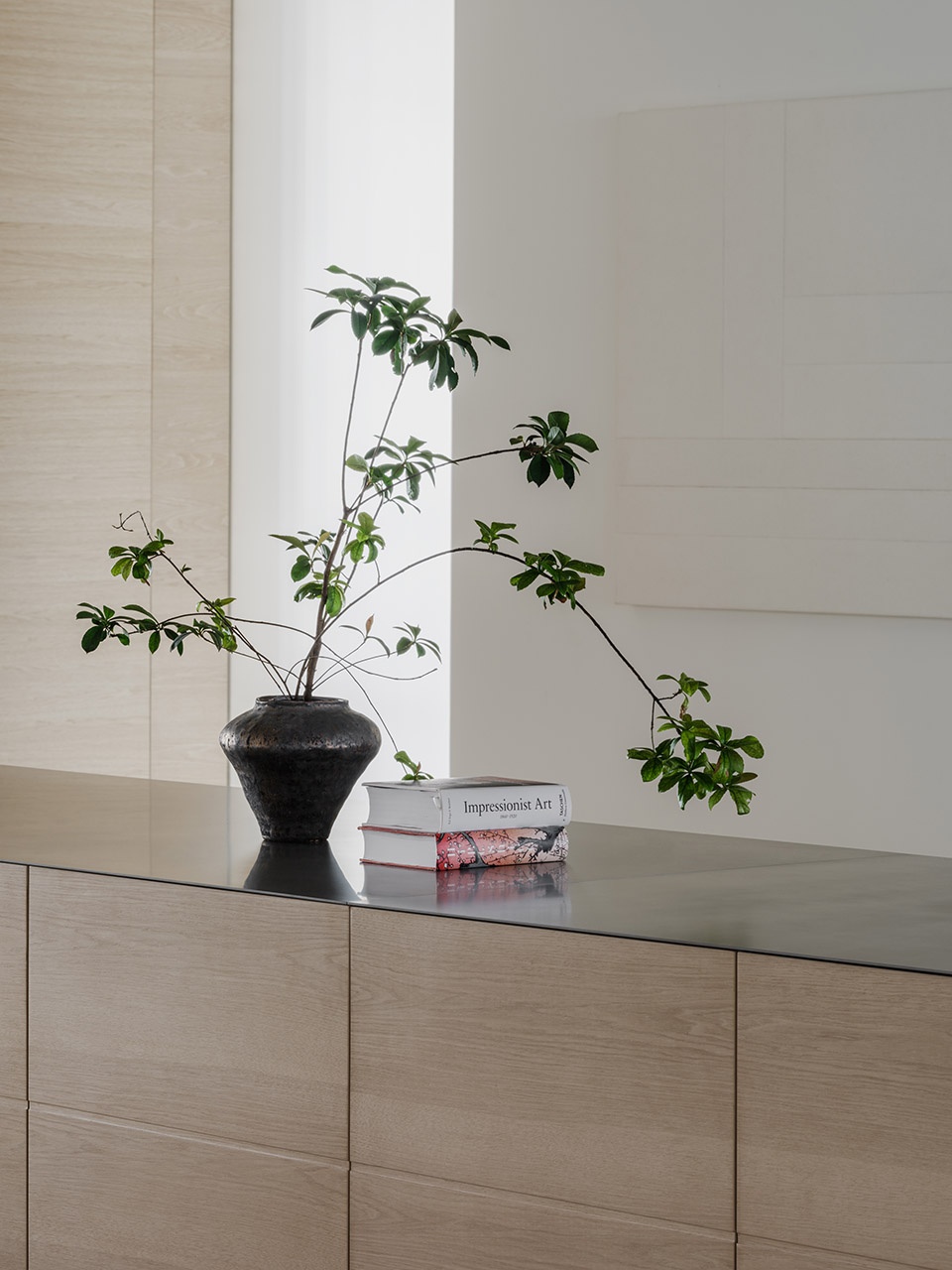 The lush vegetation and metal structure meticulously refined the office, with precise craftmanship lending a sophisticated tactile experience. The integration of natural wood grains and stone texture subtly infuses the space with elegance. When light creeps through the corridor, refracting onto the garden window, casting delicate shadow patterns that blur the boundaries between interior and exterior, intertwining their flow of narratives.