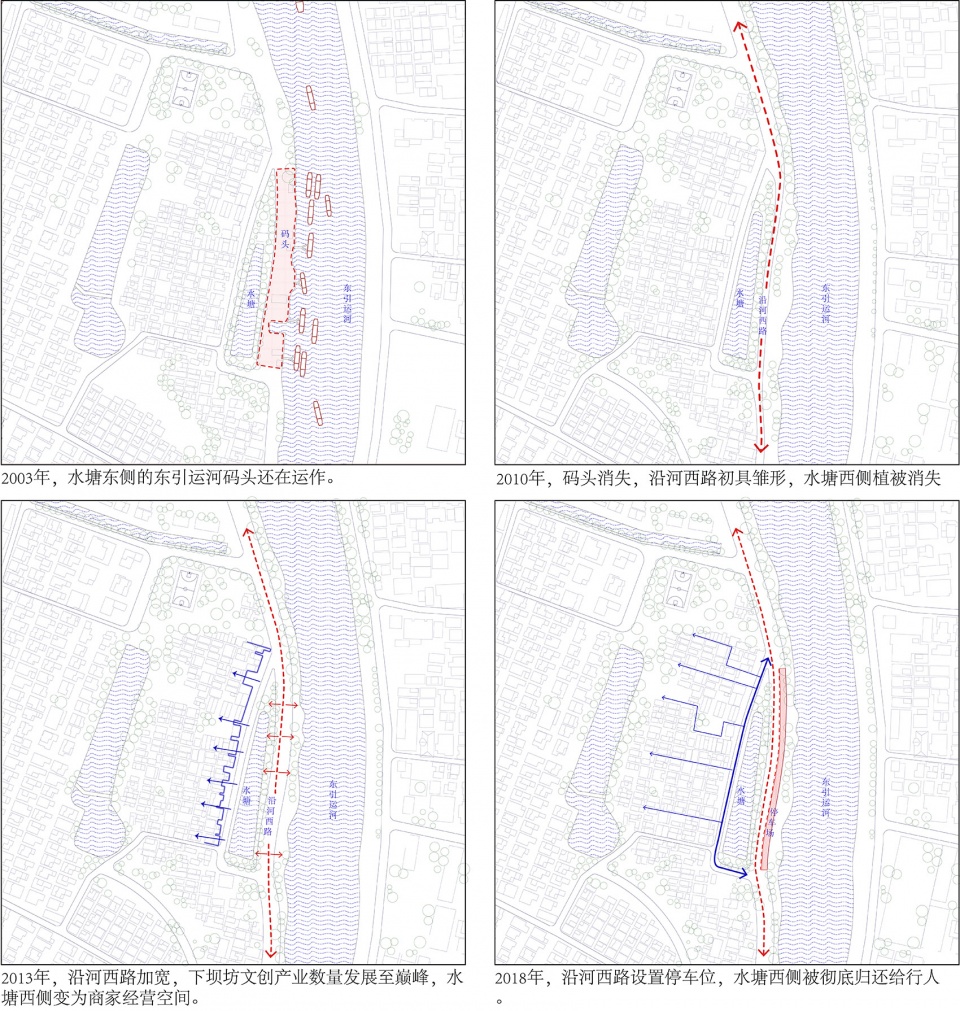 新的设计任务,希望我们以相对低成本的方式,对下坝坊入口的公共环境做一些提升,具体介入方式则由我们自行选择。东侧的东引运河在60年代修通之后,下坝坊一直与水相处, 坊前的运河码头也忙碌运作了四十多年。我们仔细阅读了坊前自1975年起的环境变迁,也发觉它与水塘的使用方式息息相关,新知旧识间,决定聚焦于此处,为当地社区提供一份重回水边的契机。