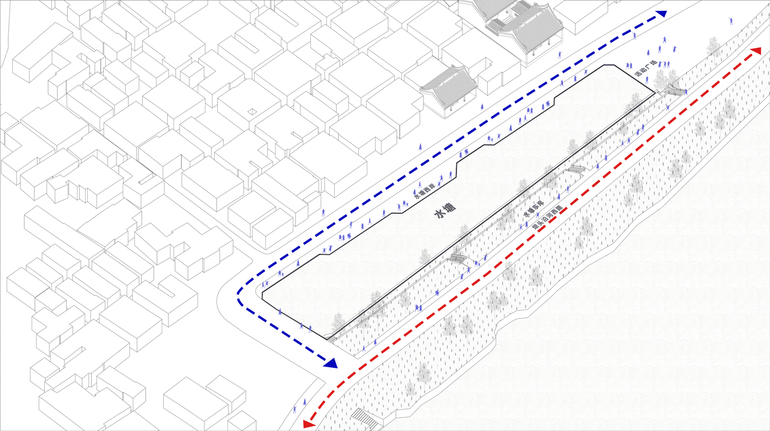 This circular path increases the usable space around the pond and creates a new waterfront experience, allowing for coexistence between tourists and villagers. The west bank remains dedicated to tourists and commercial activities, while the reopened east bank features a pavilion for rest, backed by greenery and facing the ancient village. The distance across the pond creates a subtle connection between the two sides, with the moist scenery fostering a sense of mutual companionship.