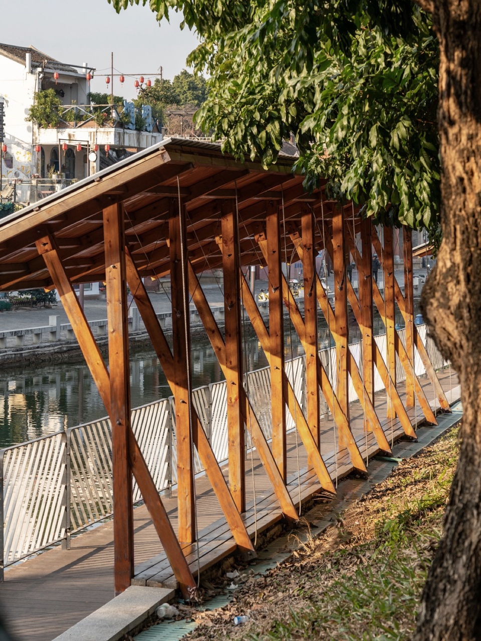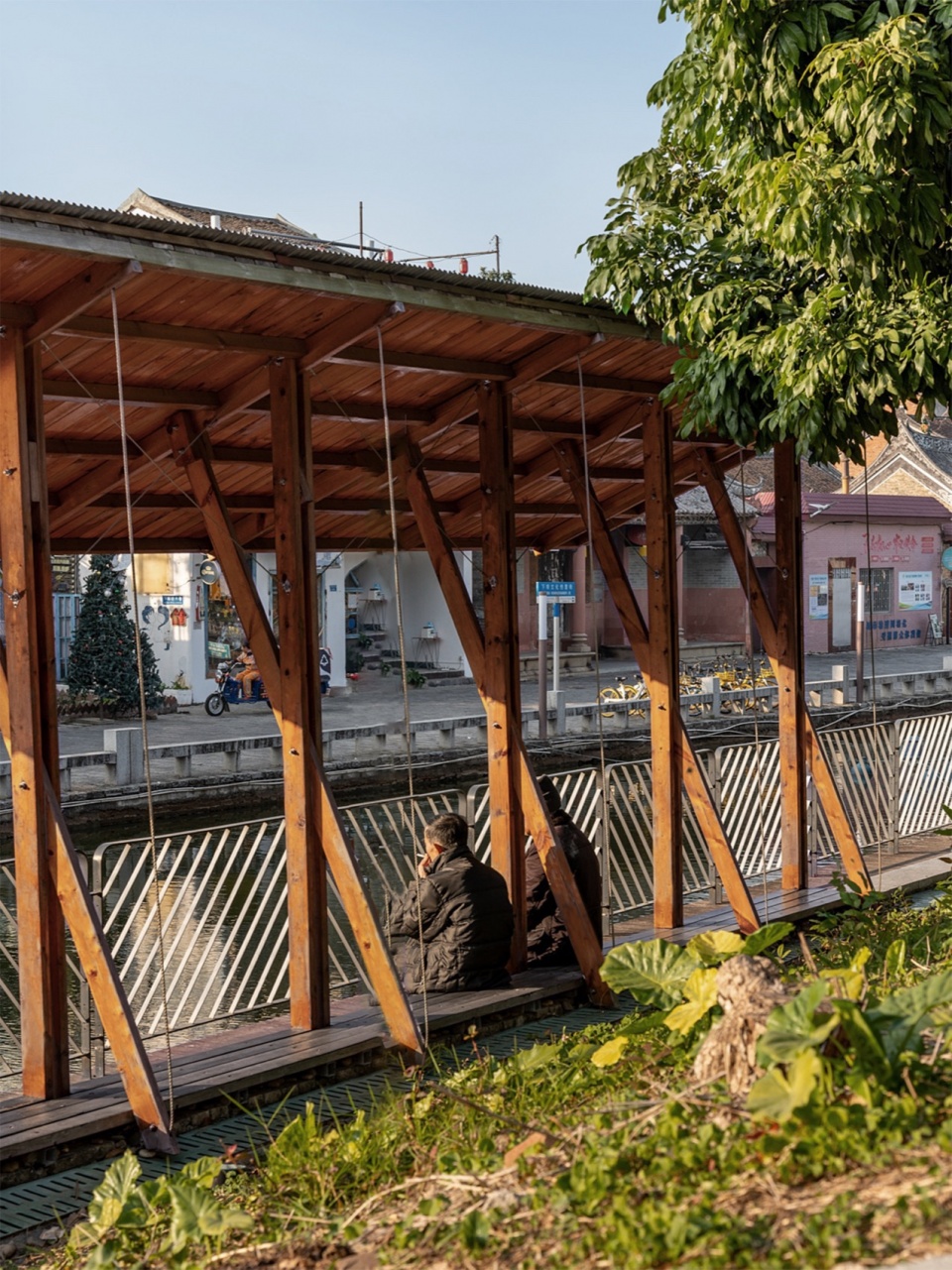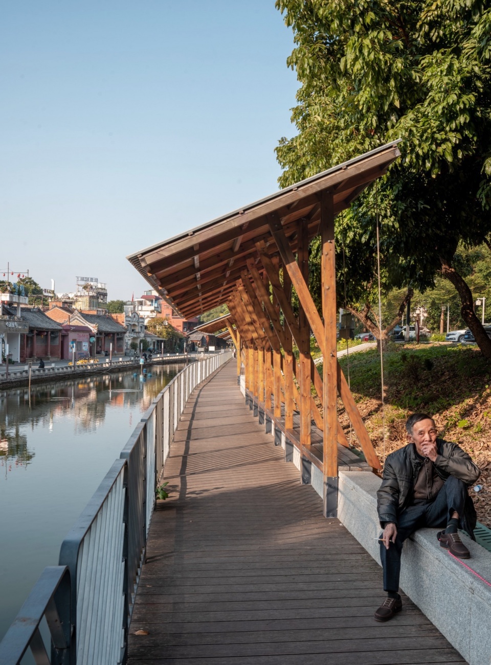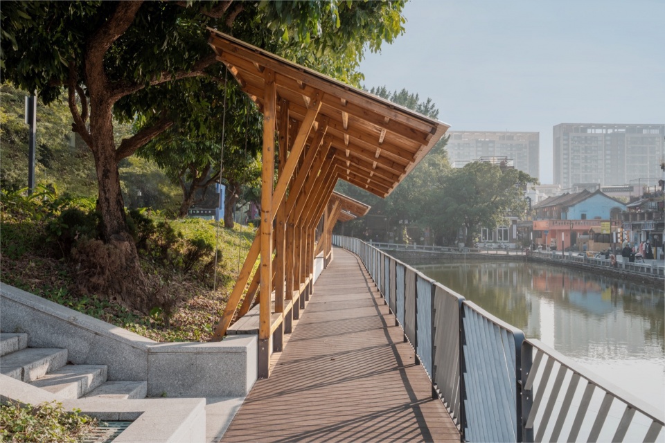 西岸已然琳琅纷繁,东岸便不宜过多瞩目。亭子的单坡悬挑,提供荫蔽的同时,也是视觉的必要:一旁的坝头沿河西路较高,视线俯看过来,倾斜的屋檐露出木色的底面,融入自然和树影;而面对西岸的宰制,则呈现内敛的檐下空间,提示公共场景的借地发生。