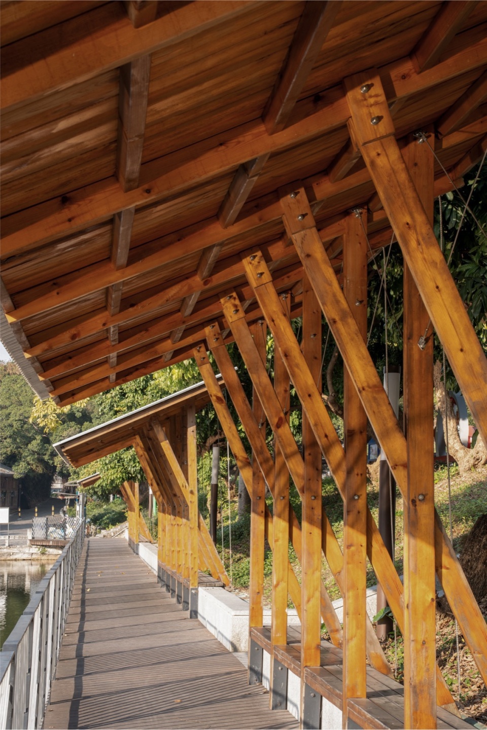 We opted for modular construction based on the overhang design to control costs further. Each module includes connections to the foundation, railings, columns, seating, steel cables, and the roof. These modular structures are arranged linearly along the walkway and placed in straight sections to avoid the natural curves of the site. Steel frames support the anti-corrosion wooden deck, with wooden columns and diagonal braces holding up the sloping wooden beams, stabilized by steel cables and covered with corrugated aluminium panels.