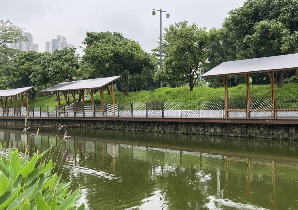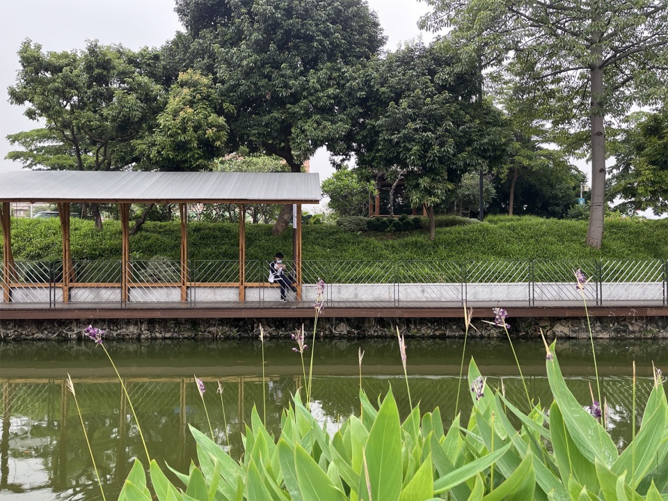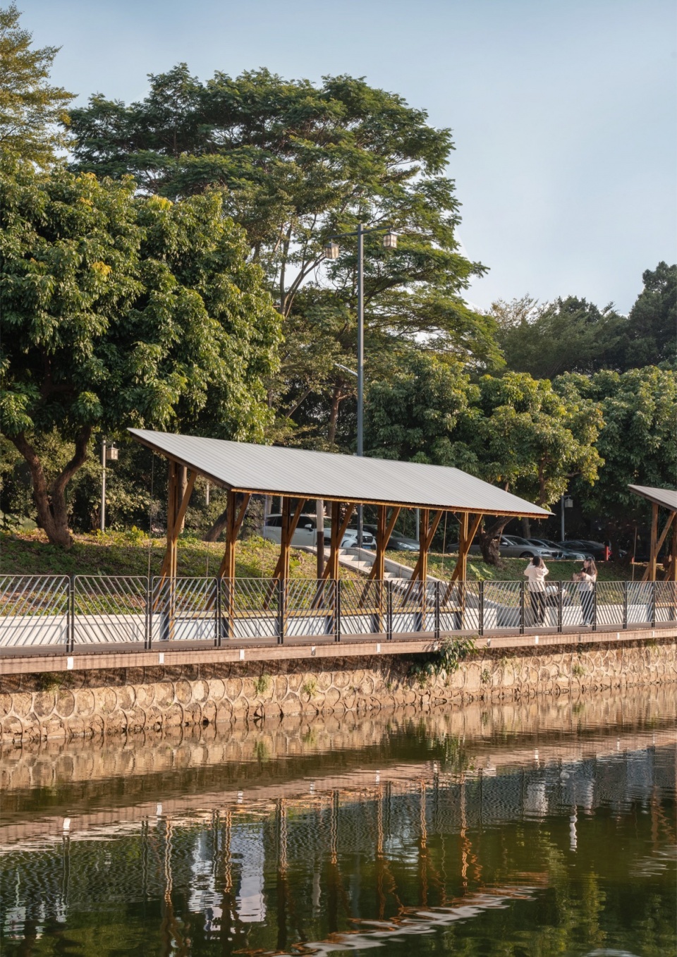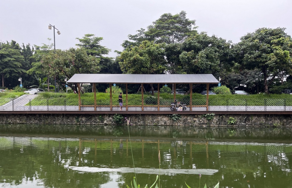 The lush greenery along the embankment is a key visual memory of the pond’s west bank. The linear pavilion by the water was not designed as a continuous structure. Excessive intervention would obscure the beautiful scenery behind it, which is not what we desire. Instead, we placed five small pavilions of varying lengths along the inner side of the walkway, spaced between the trees. The height of the pavilions was kept below the tree canopy, respecting the scale of the site and ensuring that the space beneath the eaves remained green.