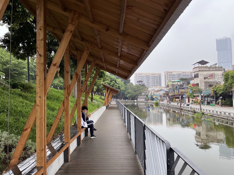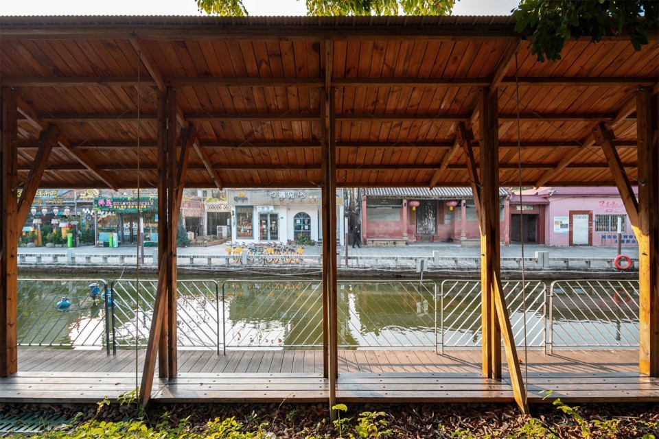 With the west bank already bustling, the east bank should not draw too much attention. The pavilions’ single-slope overhang provides shade while serving a visual purpose. From the higher vantage point of Batou Yanhe West Road, the tilted eaves reveal a wooden underside, blending into the natural surroundings and tree shadows. Meanwhile, facing the dominance of the west bank, the pavilions present a modest space beneath the eaves, hinting at the potential for public activities.