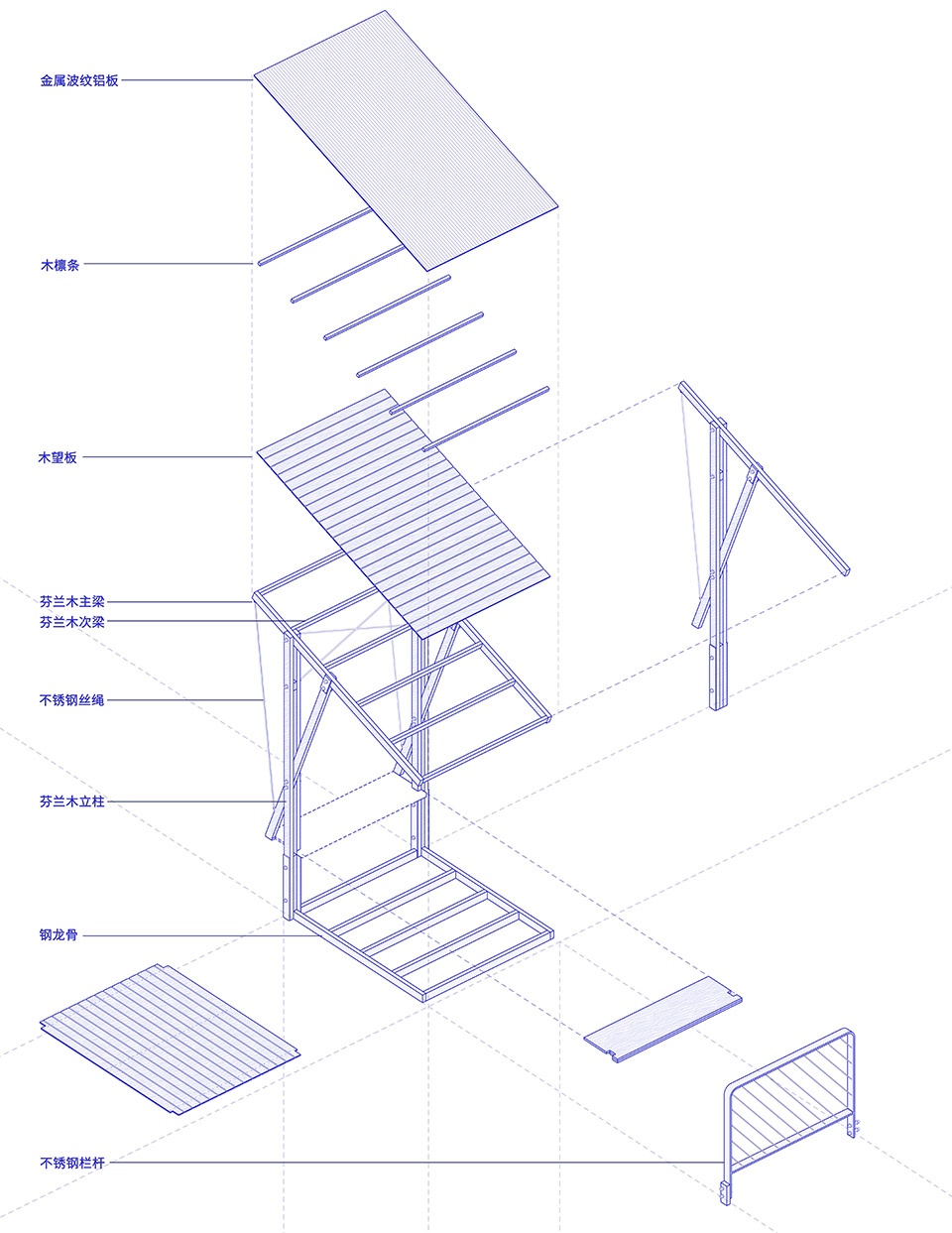 为了成本的进一步控制,我们选择在悬挑的基础之上,以模块化的方式进行建造。单个模块包括与基础的连接、栏杆、立柱、座椅、钢拉索和屋檐,模块化的结构横向展开,嵌入线性的空间廊道,并选择在完整直线段落位,避开场地的自然曲线。钢龙骨上铺设防腐木路面,木柱和斜撑架起倾斜的木梁,结合拉锁共同稳定上覆金属波纹铝板的屋面。