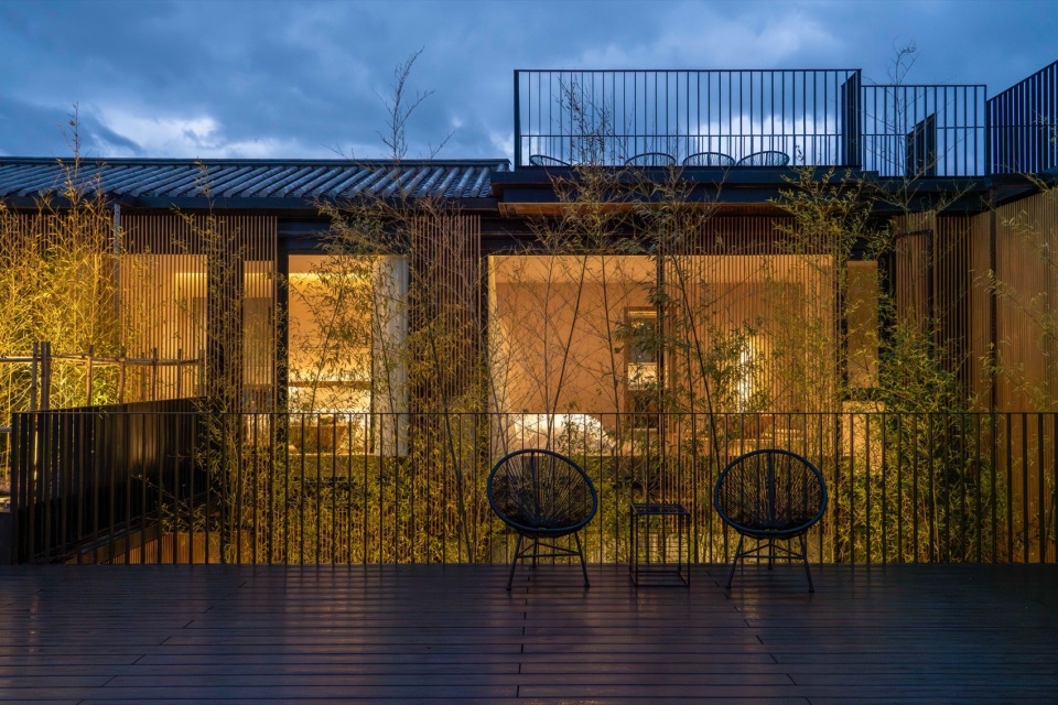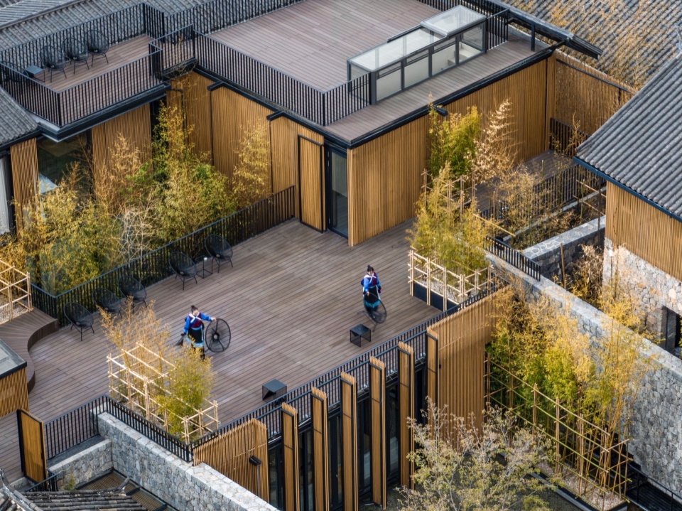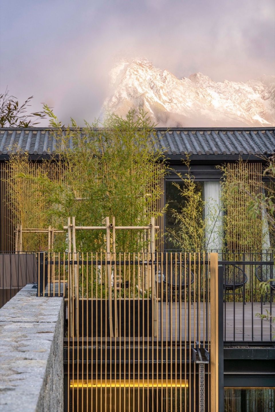客房部分与原有纳西老院子相连,使新旧建筑产生连续的对话。建筑的界墙在转角处形成独特的角院,使每间客房都拥有一个独立的小庭院,且每个庭院都独一无二。这种空间组织方式,使厚苑虽然整体内向,却并不封闭。水院与客房、露台与庭院、新院与老院之间建立起多重对话,在层次的交错中消解传统建筑的边界感。