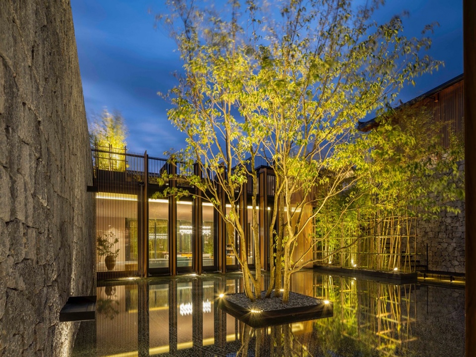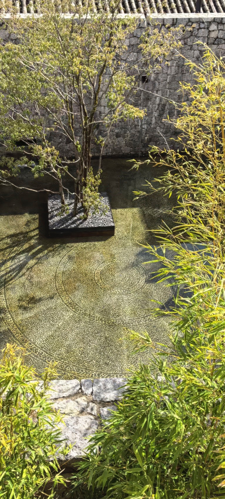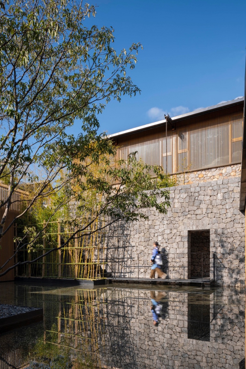 入口水系循序渐进,引导访客穿行于石、水、竹交错的自然序列中。这一动线如同《桃花源记》中所述:“初极狭,才通人。复行数十步,豁然开朗。”水不仅是物理的存在,更是空间的线索,将纳西文化与建筑体验有机融合。