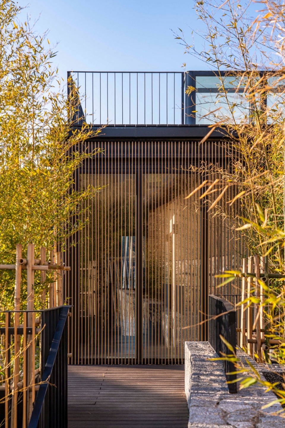 建筑的内向策略不仅是形式上的内向,更是一种与环境共生的方式。空间通过层次的递进、庭院的布局以及水系的引入,使整个场所既是自成一体的,又与周边村落形成对话的联系。在这一模式下,建筑超越了传统意义上的封闭与开放,构建了一种内外交融的空间关系。