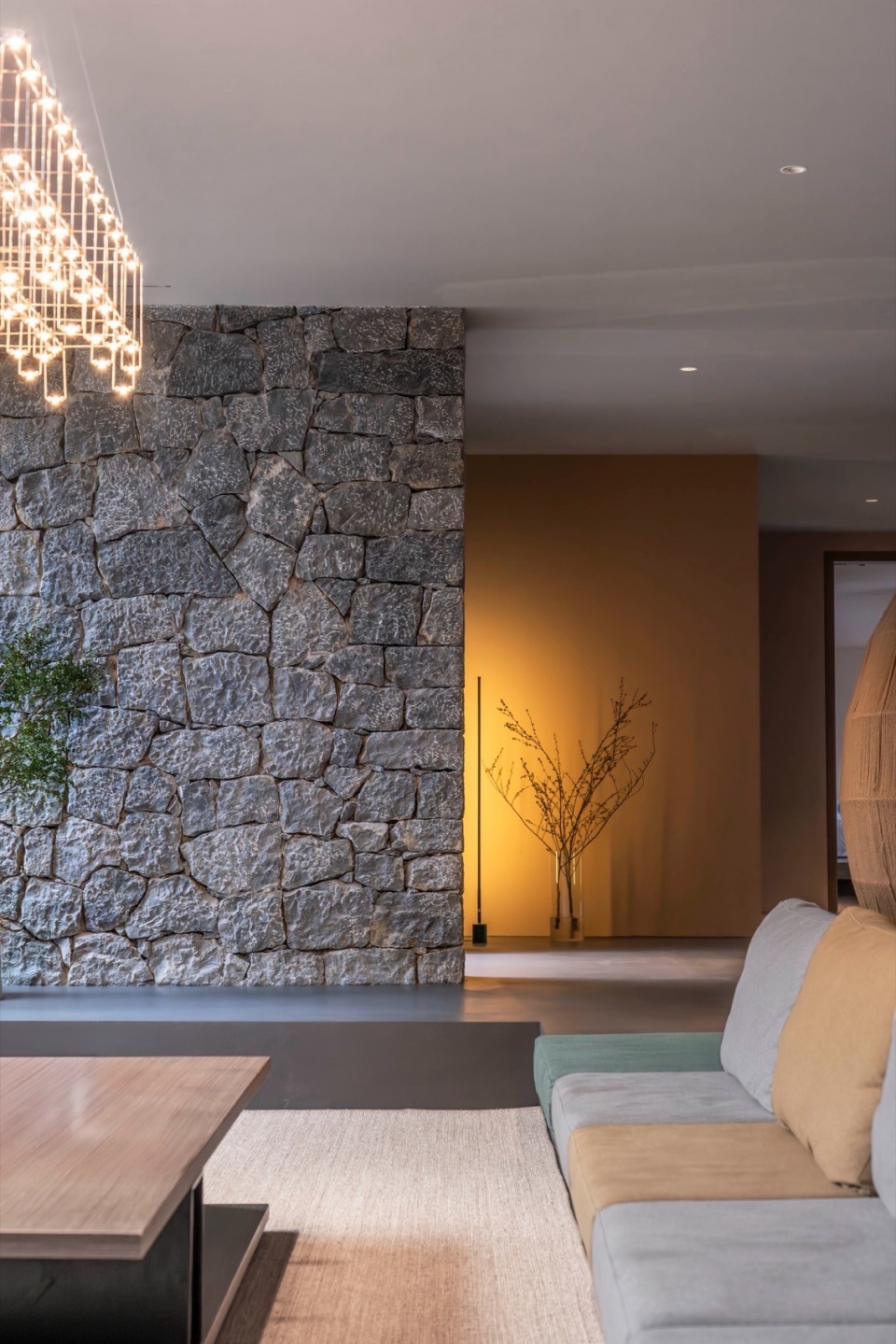 The central water courtyard becomes the visual and sensory core, its flowing water and reflections giving dynamic rhythm to the space. On one side is the living room; on the other, the dining room. Both spaces unfold around the water courtyard, with their functions permeating one another, creating a flexible and layered spatial experience. The wooden grille of the living room can be opened or closed, allowing openness or privacy to be adjusted according to the context.