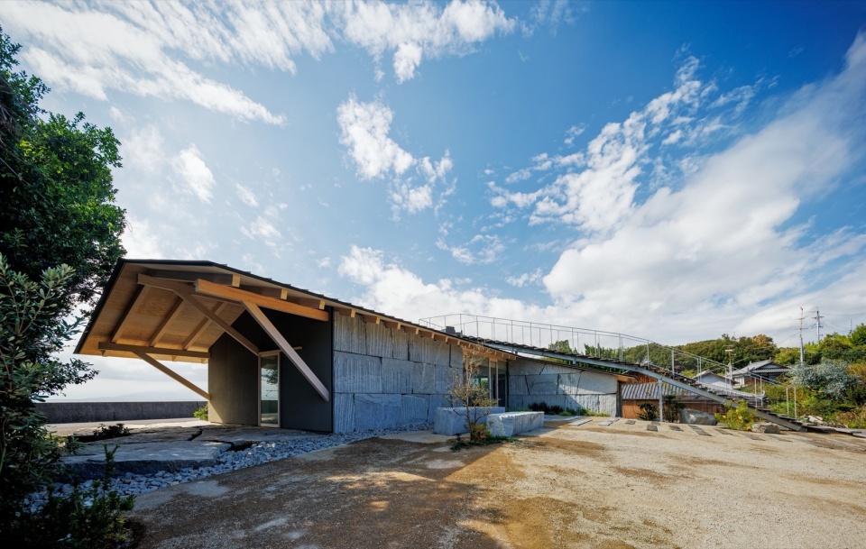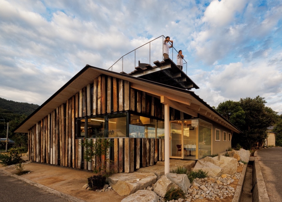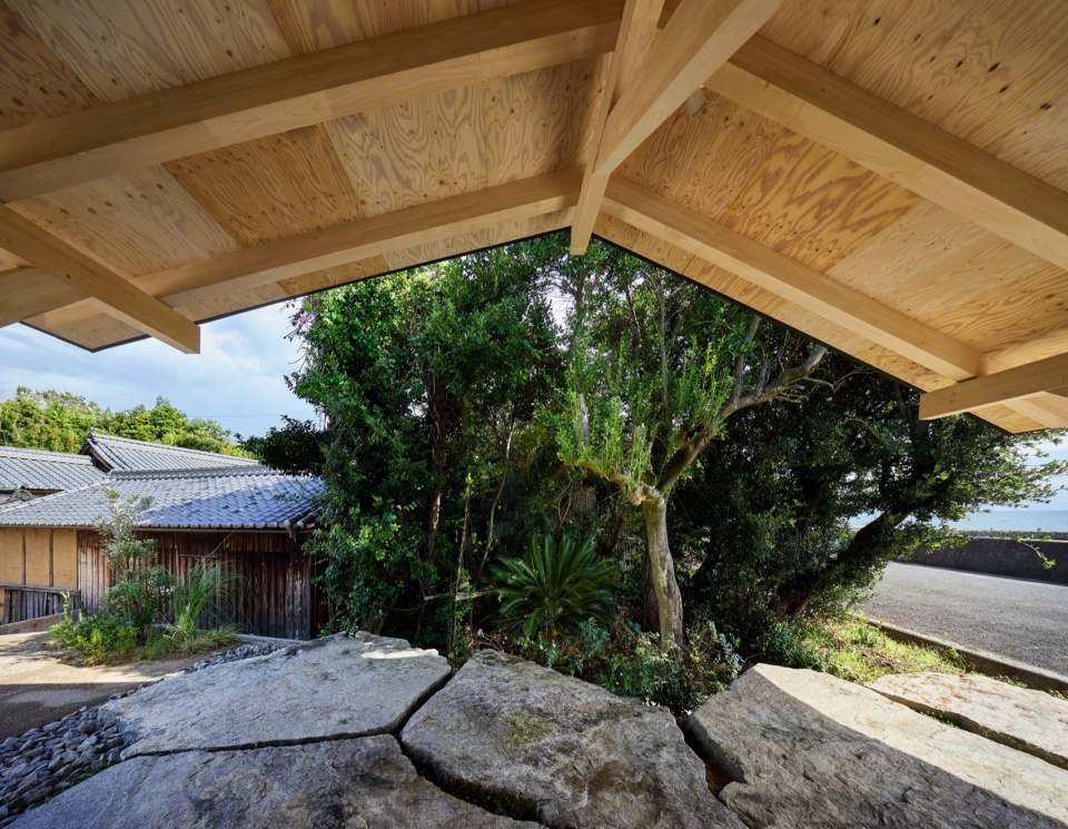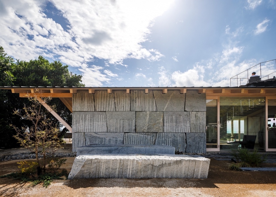 Impressed by the coarse expression of the local quarry, uneven surfaces of the Oshima stone and were combined with recycled weathered ship bottom planks to match the impressive look.