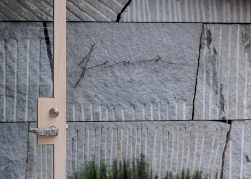 灵感源自当地采石场粗犷而原始的质感,设计结合了大岛石不规则的天然肌理与回收的旧船底木板,使建筑展现出独特而富有层次的视觉张力。